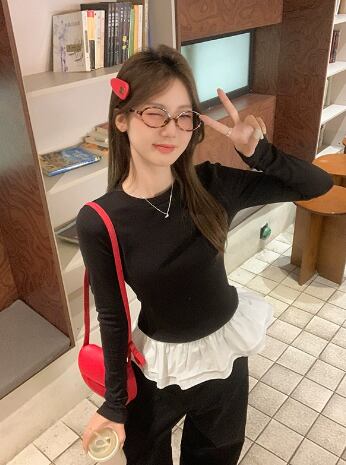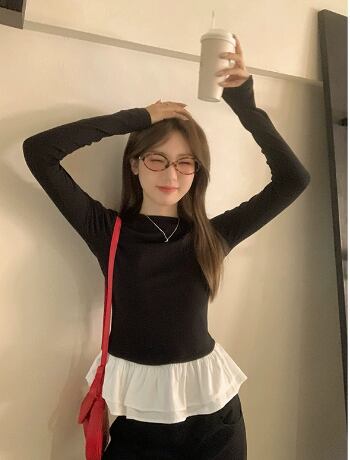 切り替えデザインとフリルが華やかに映える、細身シルエットの丈長カットソー。