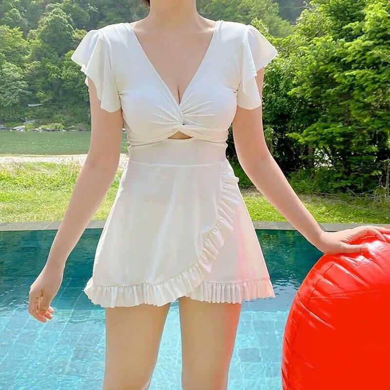 水着 レディース ワンピース 半袖 大人可愛い きれいめ 華やか 大人っぽい おしゃれ お洒落 ガーリー クール かっこいい セクシー 無地 リゾート 旅行 温泉 プール 夏 海 ビーチ 10代 20代 30代 美脚 韓国 高見え 格上げ モテ 背中見せ インスタ映え M L ホワイト ブラック レッド