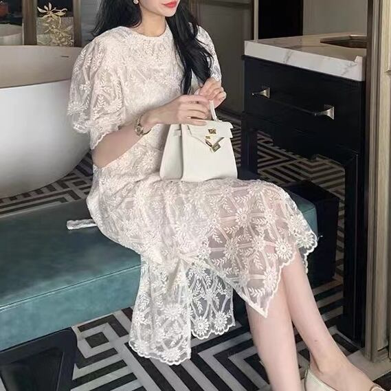 ワンピース ミモレ丈ワンピース 5分袖 パフスリーブ クルーネック ハイウエスト 刺繡 透け感 サイドスリット バックリボン 可愛い 大人可愛い きれいめ シンプル 上品 おしゃれ レトロ かっこいい カジュアル こなれ感 個性的 主役級 存在感 抜け感 春 夏 ベーシック ナチュラル エレガント フェミニン 無地 女性用 レディース ママ OL 通勤 オフィス デート お出かけ お泊まり 女子会 旅行 カフェ ショッピング パーティー 二次会 コンパ 普段使い デイリ 着回し 脚長 S M L XL