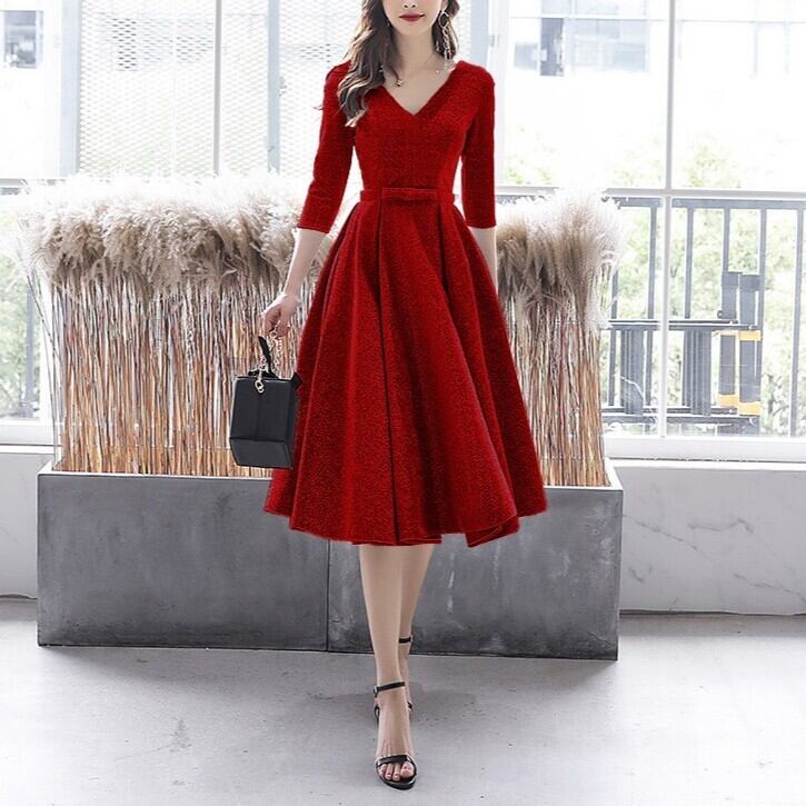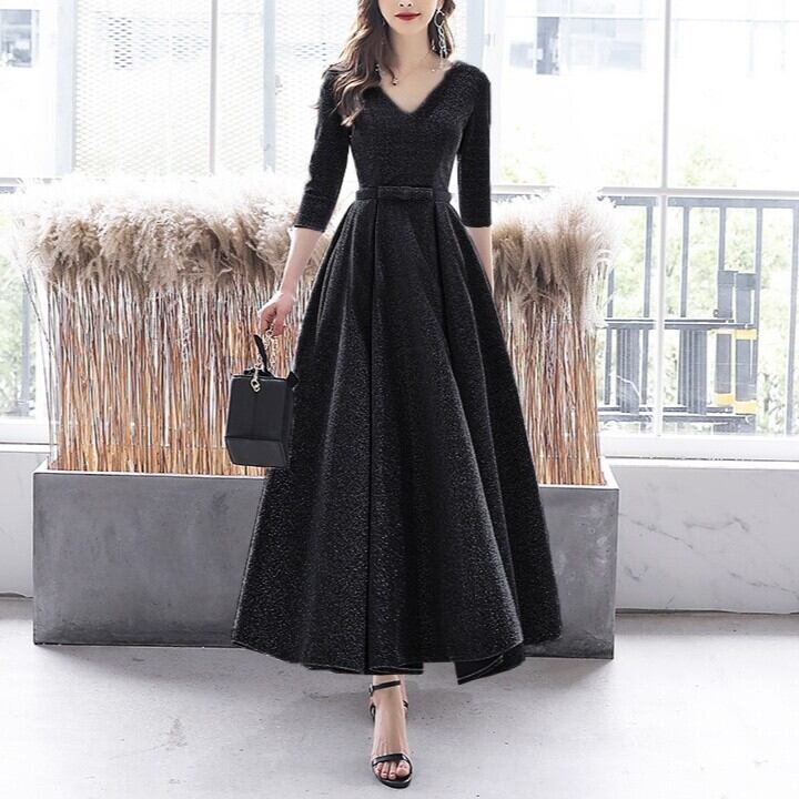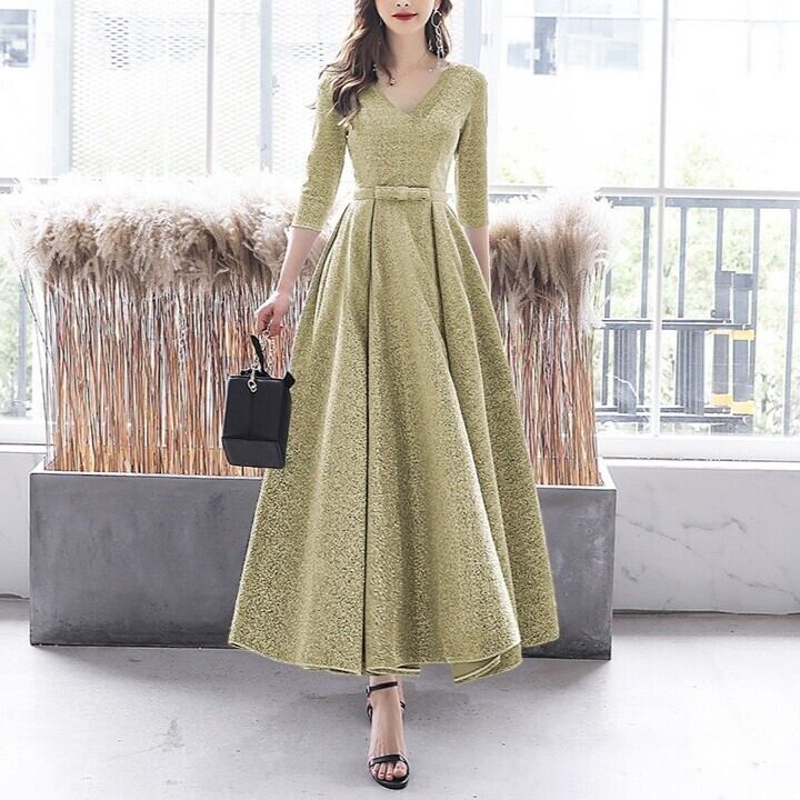 大人可愛いドレスワンピースの登場です!このエレガントなデザインは、7分袖とVネックが特徴で、女性らしさを引き立てつつ、シンプルながら存在感抜群。ロングとミディアム丈の2つのスタイルをご用意し、結婚式やパーティー、ショーなど様々なフォーマルなシーンで大活躍します。また、ガーリーな印象とクールな雰囲気を両立させた一着で、あなたのスタイルを格上げしてくれます。