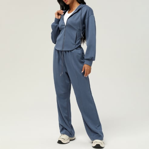 レディース パンツ パーカー 部屋着 上着 ツーピース 丈長 ハーフ 長袖 フード ストレート ポケット 前開き ジッパー ポリエステル ビスコース レーヨン かわいい シンプル カジュアル おしゃれ かっこいい ラフ 無地 秋 冬 大会 ママ マタニティ 10代 20代 30代 40代 学生 部活 お泊まり アウトドア キャンプ ジム 重ね着 お揃い 楽ちん 普段使い 着回し 定番 S M L XL 黒 グレー ブルー アプリコット