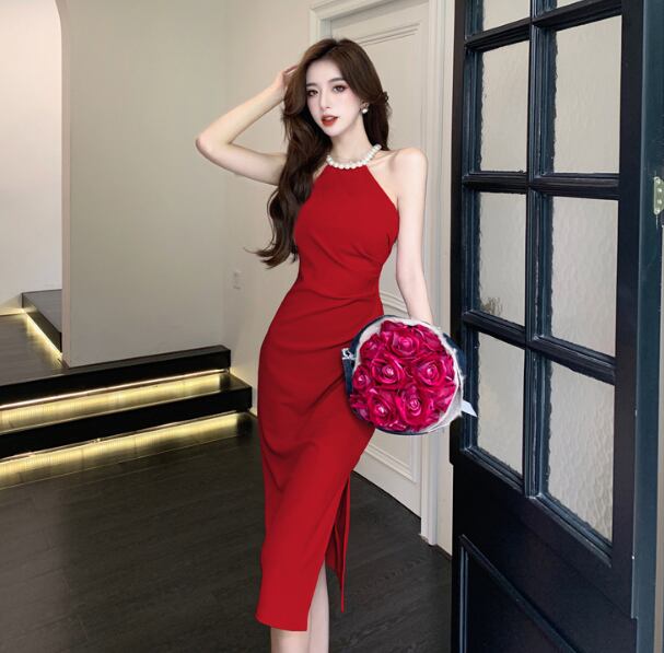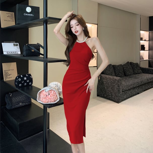 ホルターネックの洗練シルエットが美しく際立つ、ミディ丈タイトドレス。