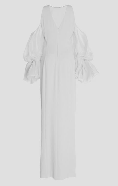 肩出しデザインが視線を惹きつける、ロング丈のドレス。