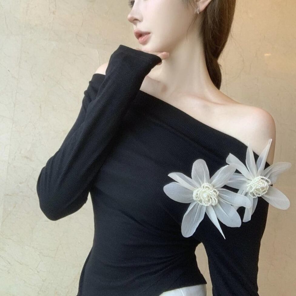 カットソー トップス シャツ オフショルダーカットソー オフショルトップス 肩出し デコルテ 長袖 無地 花付き レディース かわいい 大人可愛い おしゃれ ガーリー エレガント キュート きれいめ 上品 お出かけ ショッピング 休日 通勤 通学 デート 女子会 イベント 旅行 体型カバー ゆったり スタイルUP デイリー 普段使い フェミニン シンプル カジュアル レトロ スタイリッシュ 高見え 鮮度アップ