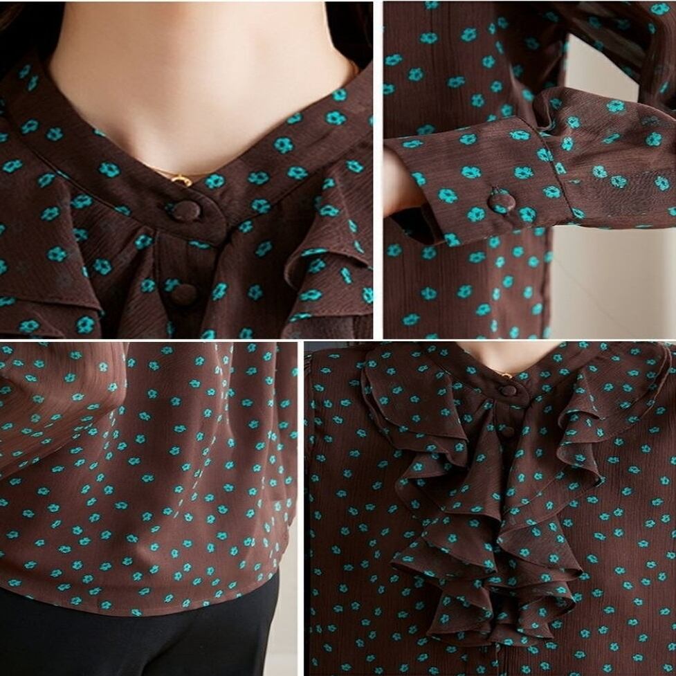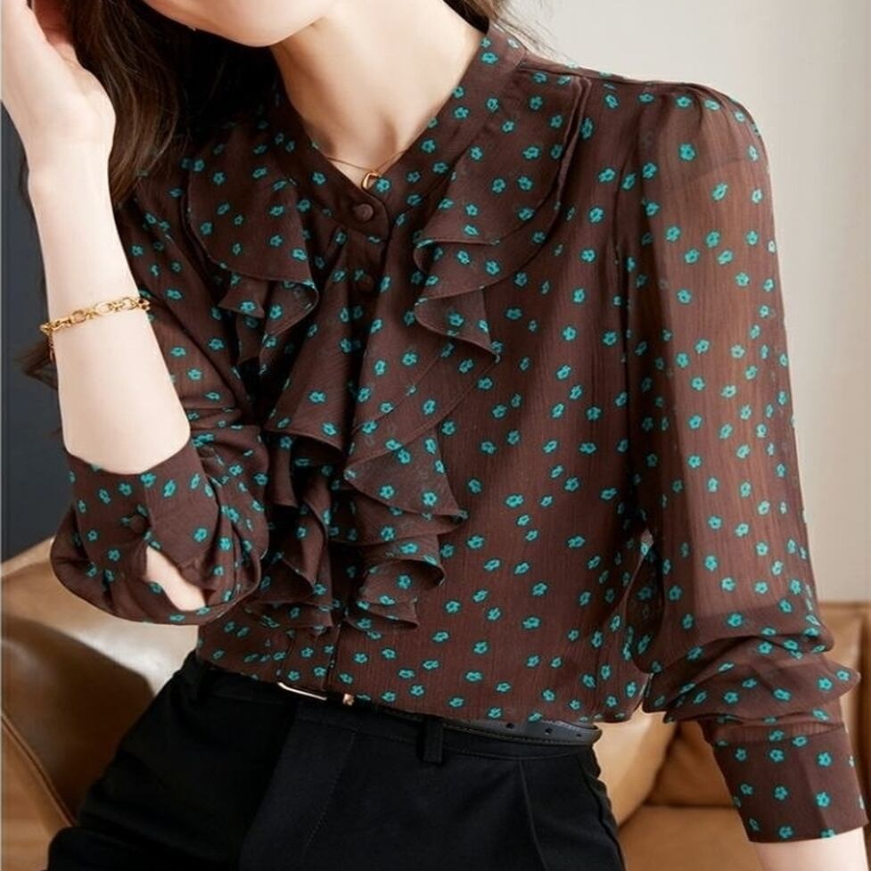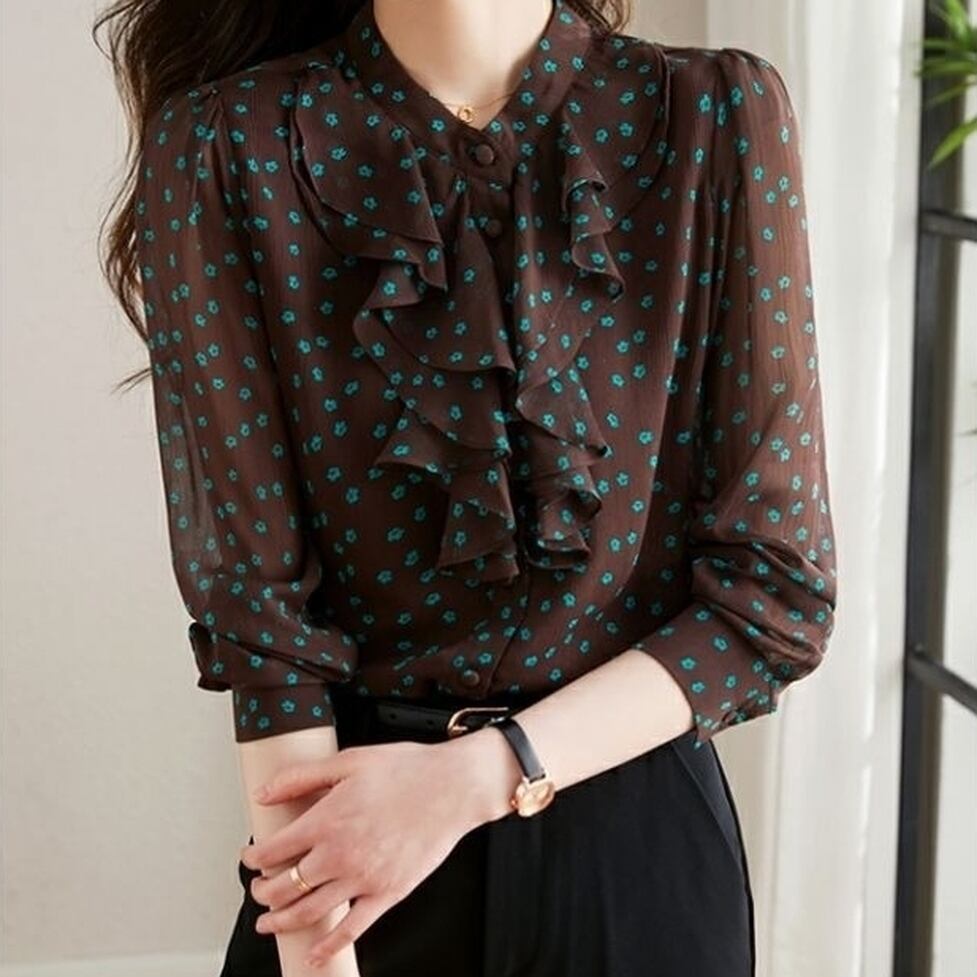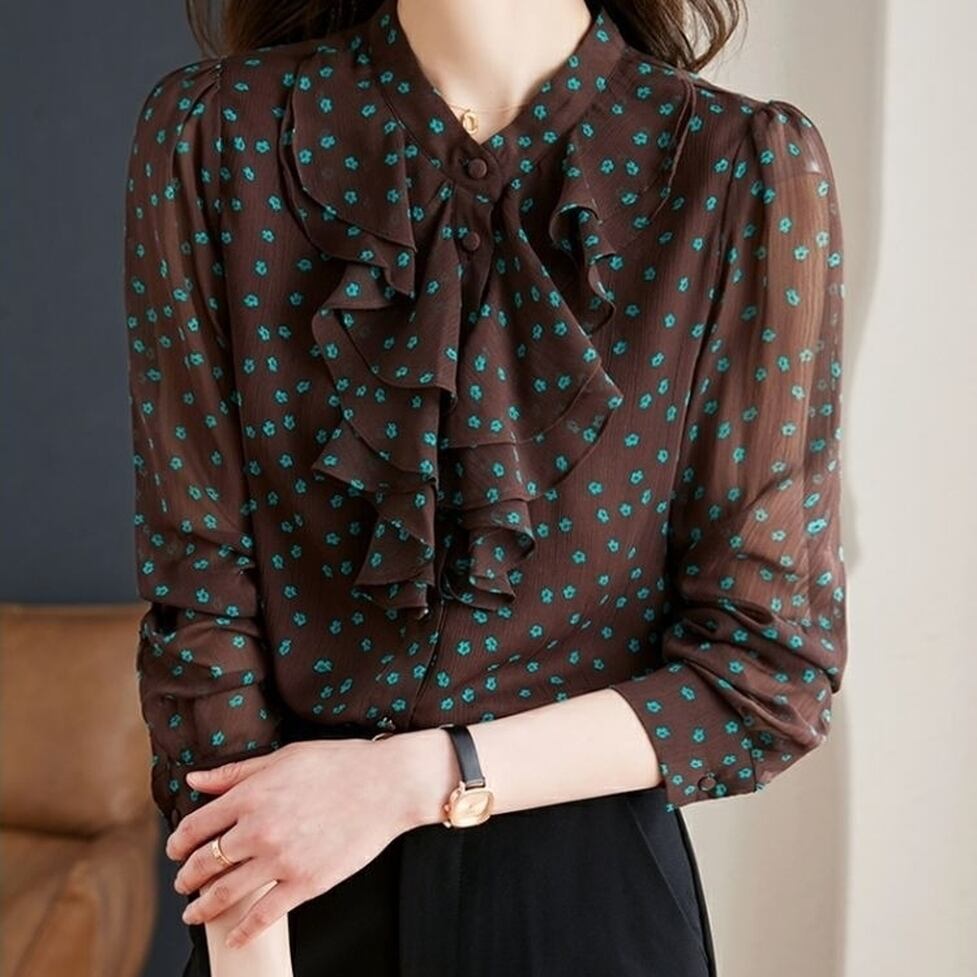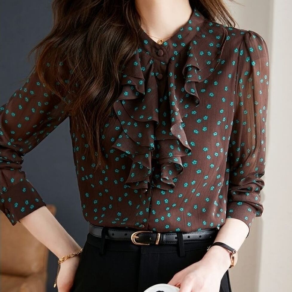 ブラウス シャツ トップス フリルシャツ シフォンシャツ フリルシフォンシャツ フリルドットブラウス ノーカラー フリル どっと柄 長袖 スリム シアーシャツ アースカラー レディース かわいい 大人可愛い おしゃれ ガーリー エレガント キュート きれいめ 上品 お出かけ ショッピング 休日 通勤 通学 デート 女子会 イベント 旅行 体型カバー ゆったり スタイルUP デイリー 普段使い フェミニン シンプル クラシカル カジュアル レトロ スタイリッシュ 高見え 鮮度アップ