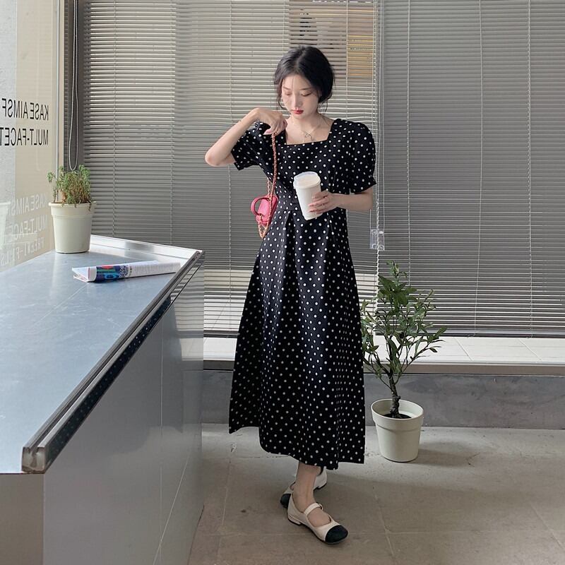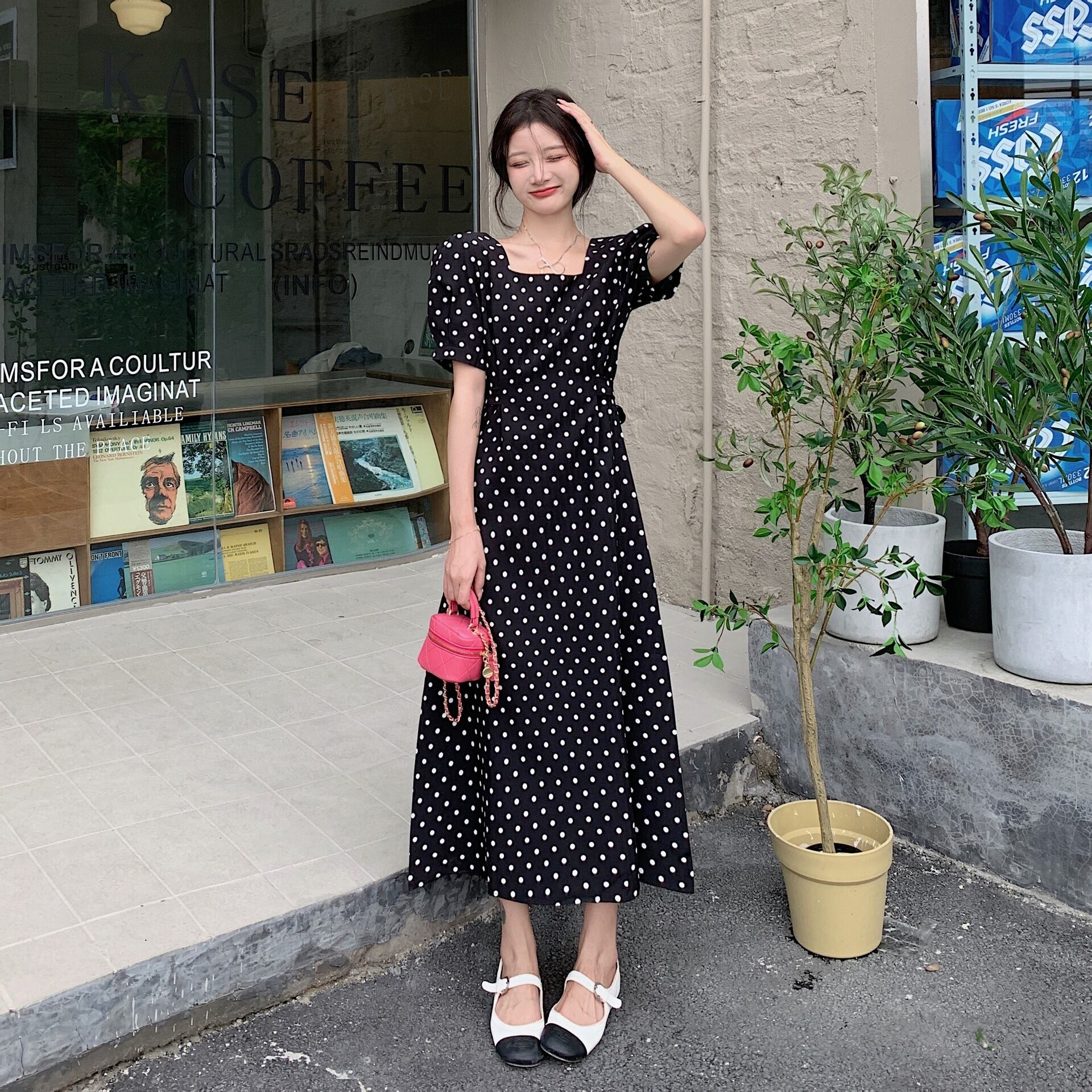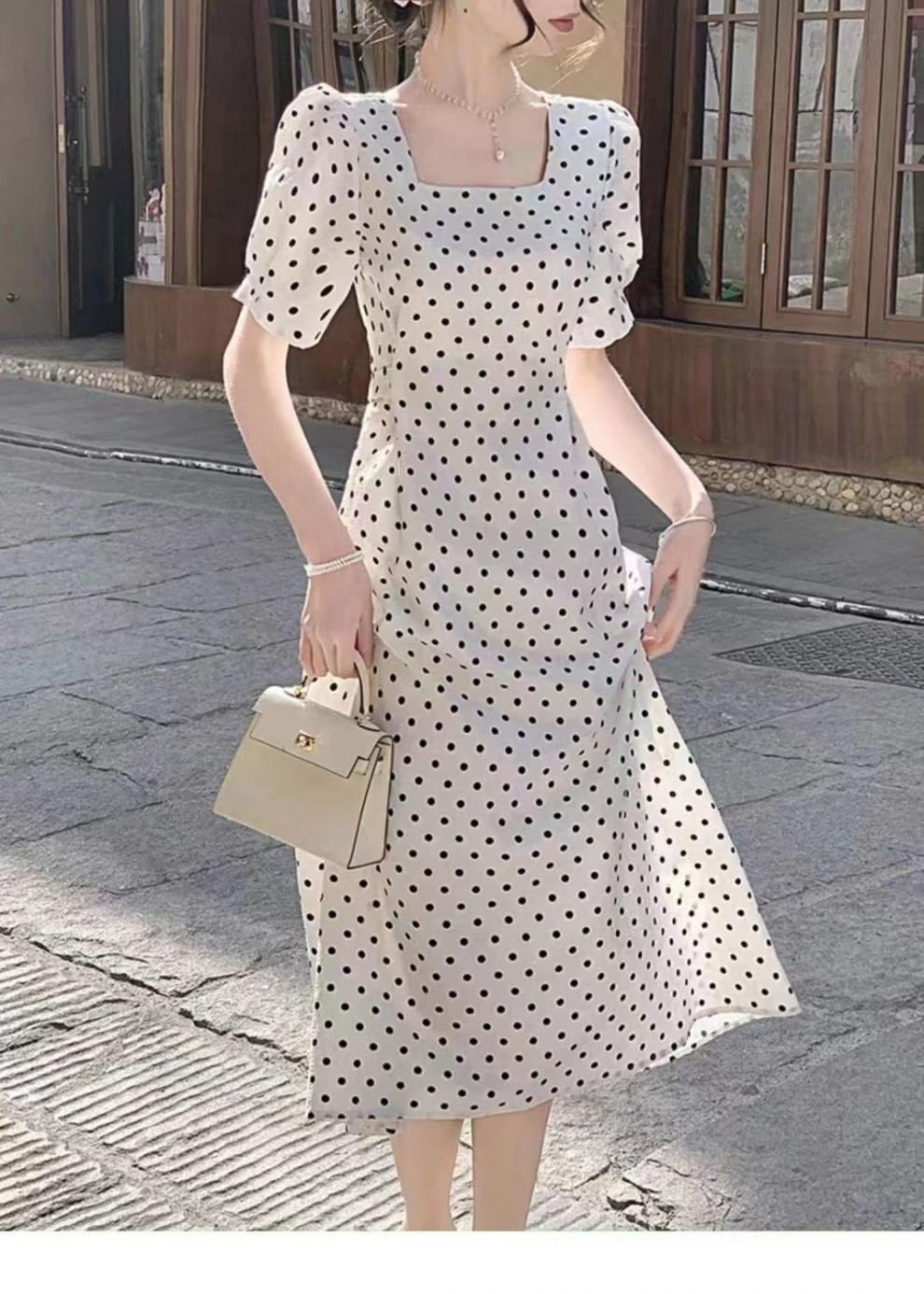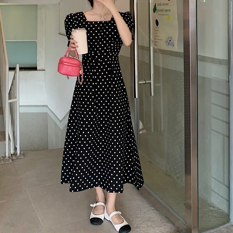 レディース ワンピース ロングスカート 膝下 ロング 8分丈 丈長 半袖 ボリューム袖 バルーン袖 スクエアネック 襟なし 角襟 ノーカラー セミフレア Aライン ウエストマーク 薄手 ポリエステル かわいい 大人可愛い 上品 おしゃれ レトロ ガーリー ラブリー キュート ドット柄 水玉 夏 二次会 10代 20代 30代 学生 デート お出かけ お泊まり パーティー イベント リゾート 旅行 ビーチ 女子会 バカンス ガーデン ショッピング 合コン コンパ カフェ モテ 清楚 インスタ映え M L X