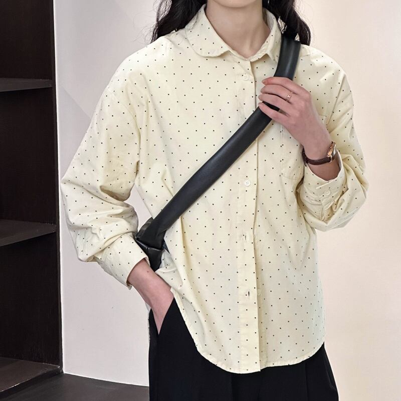トップス シャツ 長袖 襟付き 前開き ボタン 胸ポケット ミディアム丈 可愛い かわいい 大人可愛い きれいめ シンプル 上品 おしゃれ レトロ かっこいい カジュアル こなれ感 ルーズ 個性的 主役級 存在感 抜け感 春 夏 秋 ナチュラル ベーシック キュート メンズライク ドット柄 女性用 レディース ママ OL 通勤 オフィス 学生 通学 デート お出かけ お泊まり 女子会 旅行 カフェ ショッピング アウトドア コンパ 普段使い デイリー イベント 着回し 重ね着 ワンサイズ トレンド モテ