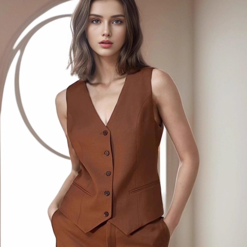 肩周りをすっきり見せる襟付きのジャケット、シンプルで合わせやすいベスト、ハイウエストデザインのロングパンツは、通勤やデート、お出かけなど、シーンを選ばず活躍します。