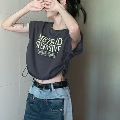 半袖のクルーネックデザインが特徴的で、ドロスト仕様のショート丈が絶妙な抜け感を与えます。