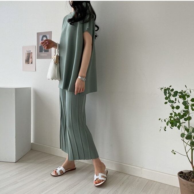 2点セット セットアップ カットソー 半袖 ラウンドネック サイドスリット プルオーバー ワイドパンツ アンクル丈 ウエストゴム リラックス 可愛い かわいい 大人可愛い きれいめ シンプル 上品 おしゃれ レトロ かっこいい カジュアル こなれ感 個性的 主役級 存在感 抜け感 春 夏 ナチュラル ベーシック 無地 女性用 レディース OL 通勤 オフィス 学生 通学 デート お出かけ お泊まり 女子会 旅行 カフェ ショッピング 普段使い デイリー 着回し 脚長 ワンサイズ トレンド モテ 楽ちん