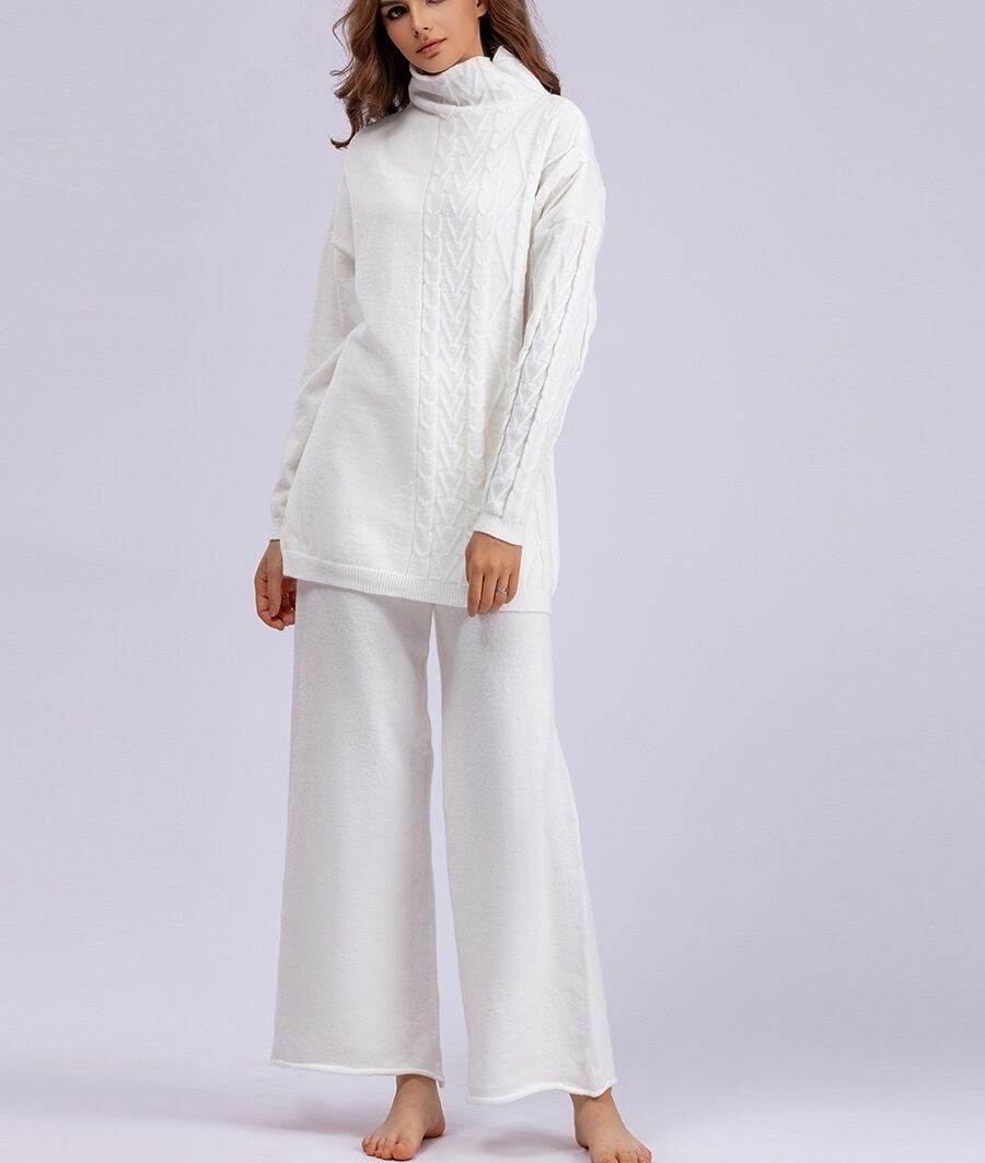 2点セット セットアップ セーター 長袖 ハイネック プルオーバー ミディアム丈 ワイドパンツ ロング丈 ニット リラックス 可愛い かわいい 大人可愛い きれいめ シンプル 上品 おしゃれ レトロ かっこいい カジュアル こなれ感 個性的 主役級 存在感 抜け感 秋 冬 ナチュラル ベーシック メンズライク 無地 女性用 レディース OL 通勤 オフィス 学生 通学 デート お出かけ お泊まり 女子会 旅行 カフェ ショッピング 普段使い デイリー 着回し 脚長 ワンサイズ トレンド モテ 楽ちん