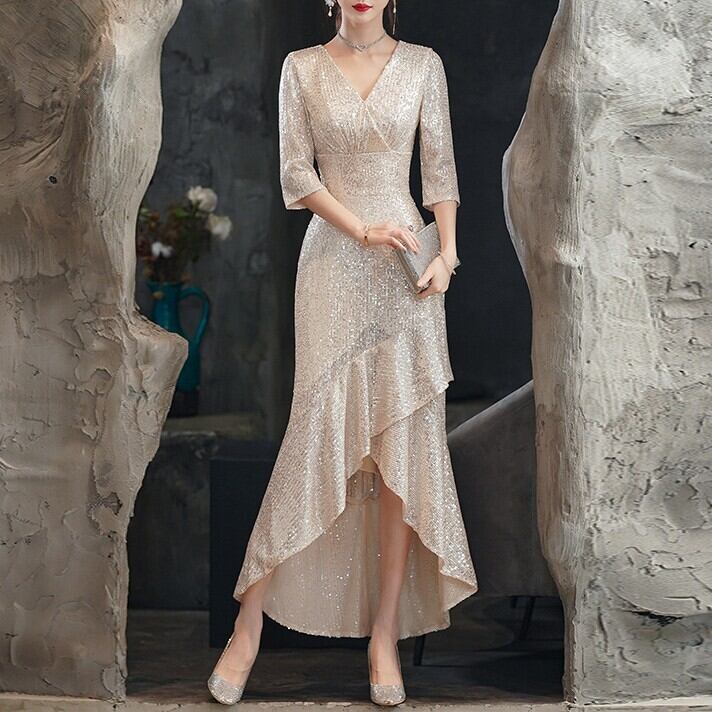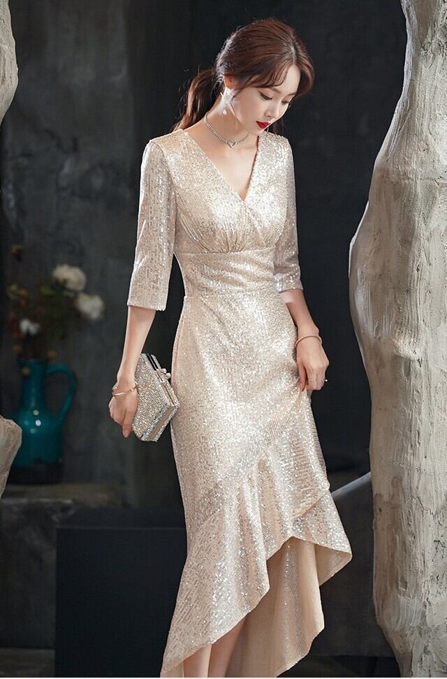 フィッシュテール スパンコール ドレス ワンピース パーティー ステージ 舞台 キャバ 衣装 演劇 ラウンジ クラブ 膝下 ロング 7分袖 Vネック カシュクール マーメイド スリム 細身 イブニング ウエストマーク ハイウエスト きれいめ シンプル 大人可愛い 上品 おしゃれ エレガント 主役級 存在感 ゴージャス 華やか イベント ホテル ガーデン レストラン 韓国 脚長 高見え 格上げ 女子会 光沢感 春 夏 秋 冬 シーズンレス 2XL 大きい ぽっちゃり S M L XL ゴールド シャンパン