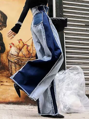レディース パンツ ボトムス デニムのご紹介です。ハイウエストデザインに施されたダメージ加工と切り替えデザインのパッチワークが、カジュアルながらも個性的な印象を与えます。また、カラーブロッキングのデザインがスタイリングの幅を広げ、普段使いから特別なお出かけまで、さまざまなシーンで活躍が期待できます。