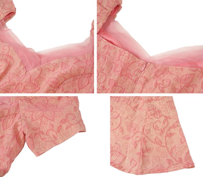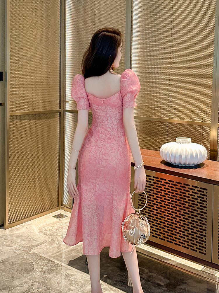 ドレス ワンピース パーティー 結婚式 二次会 演奏会 発表会 ステージ 膝下 半袖 パフスリーブ Vネック スレンダー タイト フィッシュテール マキシドレス 刺繍 薄手 ポリエステル繊維 可愛い 上品 おしゃれ エレガント 花柄 パーティー イベント リゾート ホテル レストラン 夏 S M L XL 2XL ピンク