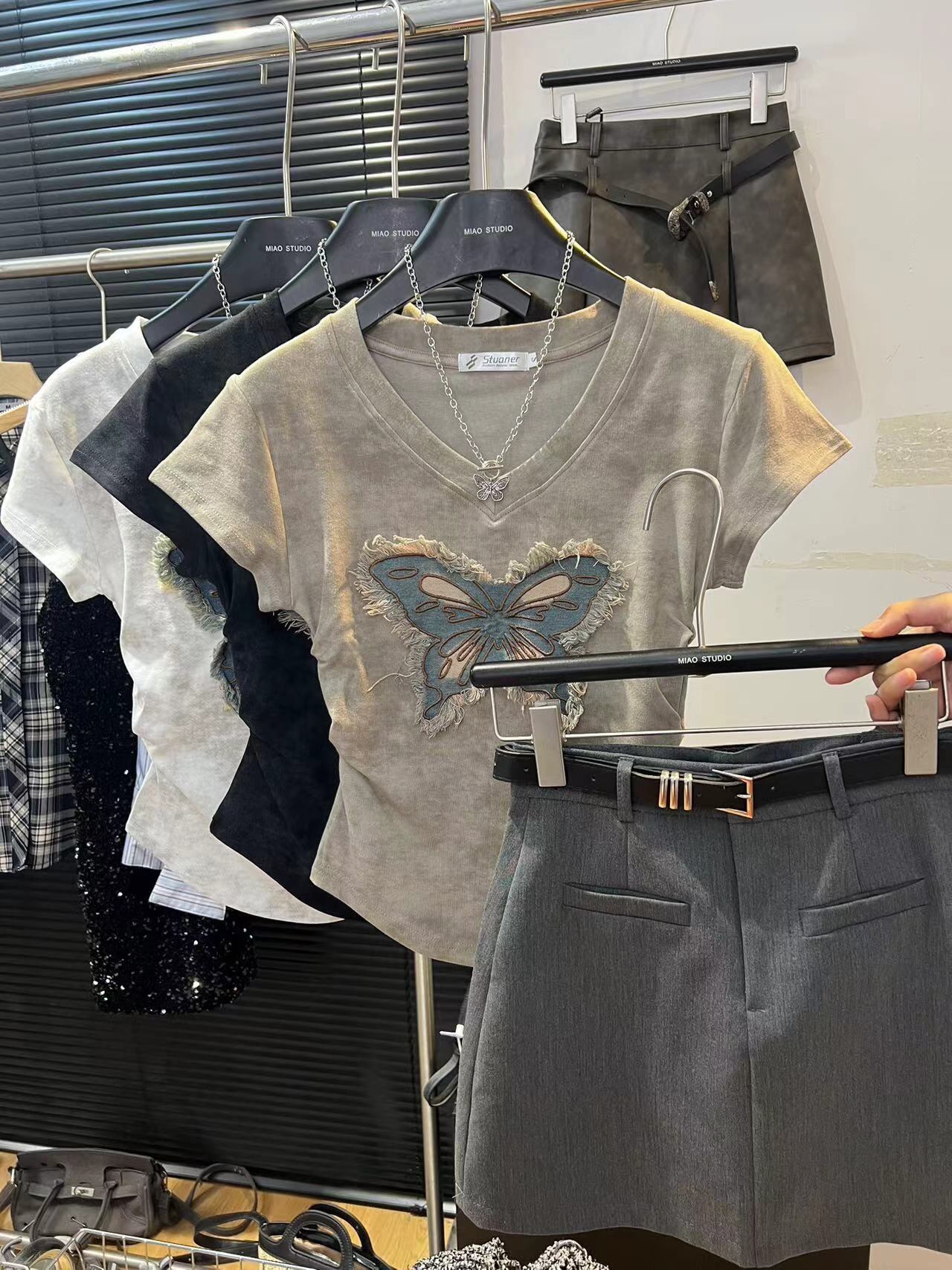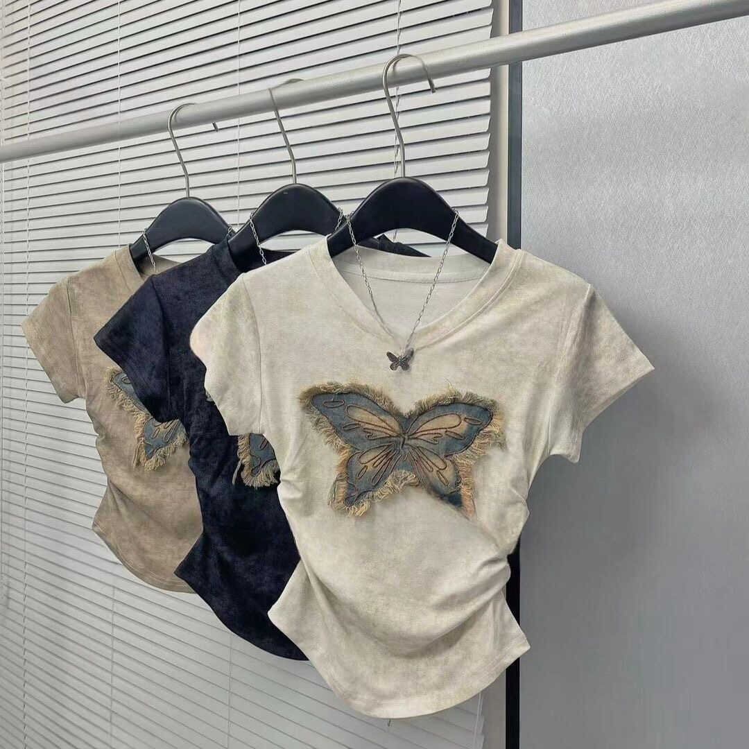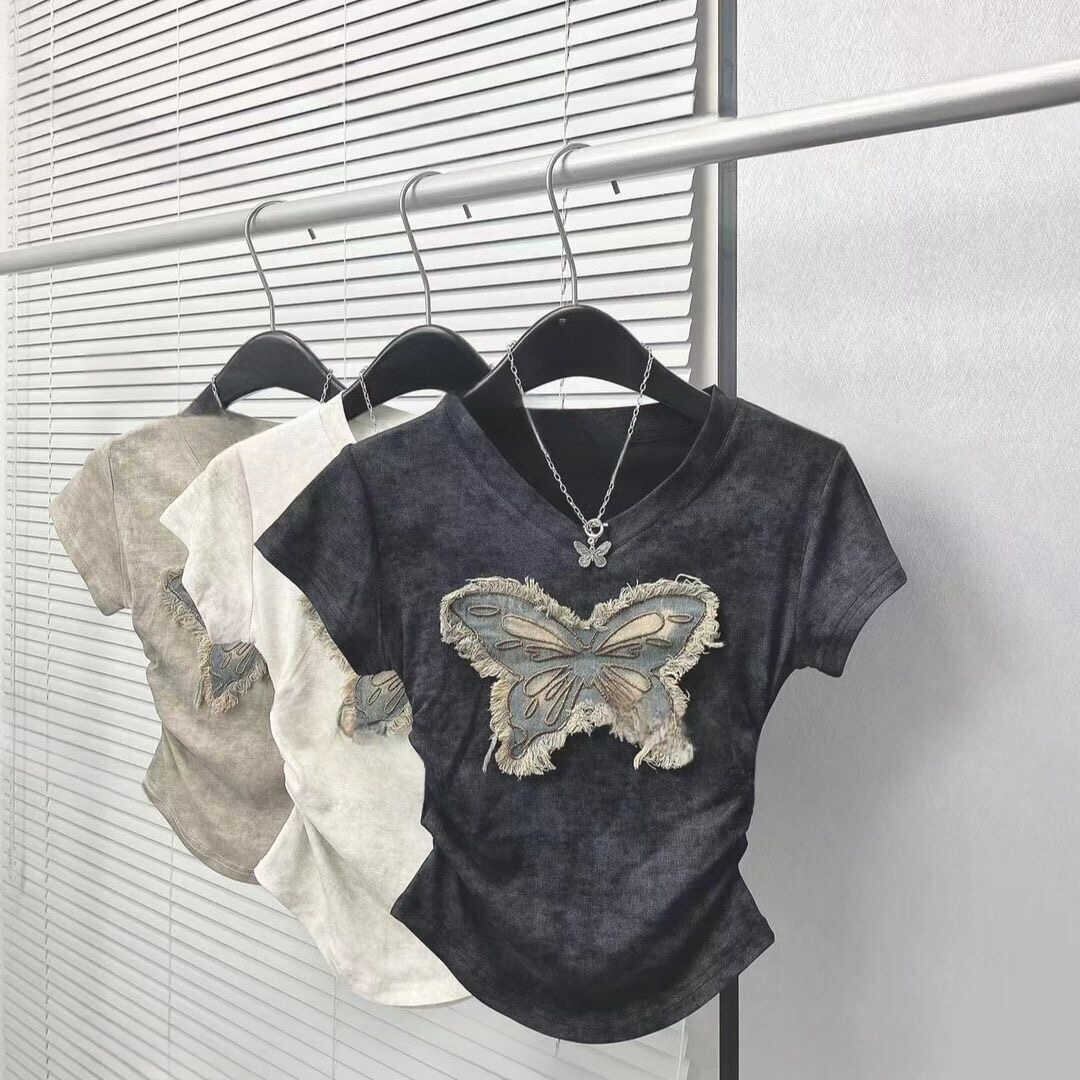 レディース トップス Tシャツ ショート 半袖 Vネック タイト スリム 細身 ストリート プリーツ コットン カジュアル おしゃれ 個性的 クール エレガント 存在感 パッチワーク 蝶 夏 デート お出かけ アウトドア キャンプ 旅行 海 プール ビーチ ジム 公園 女子会 休日 バカンス ショッピング 発表会 コンサート ライブ コスプレ カフェ 普段使い セクシー S M L XL 2XL 白 黒 カーキ