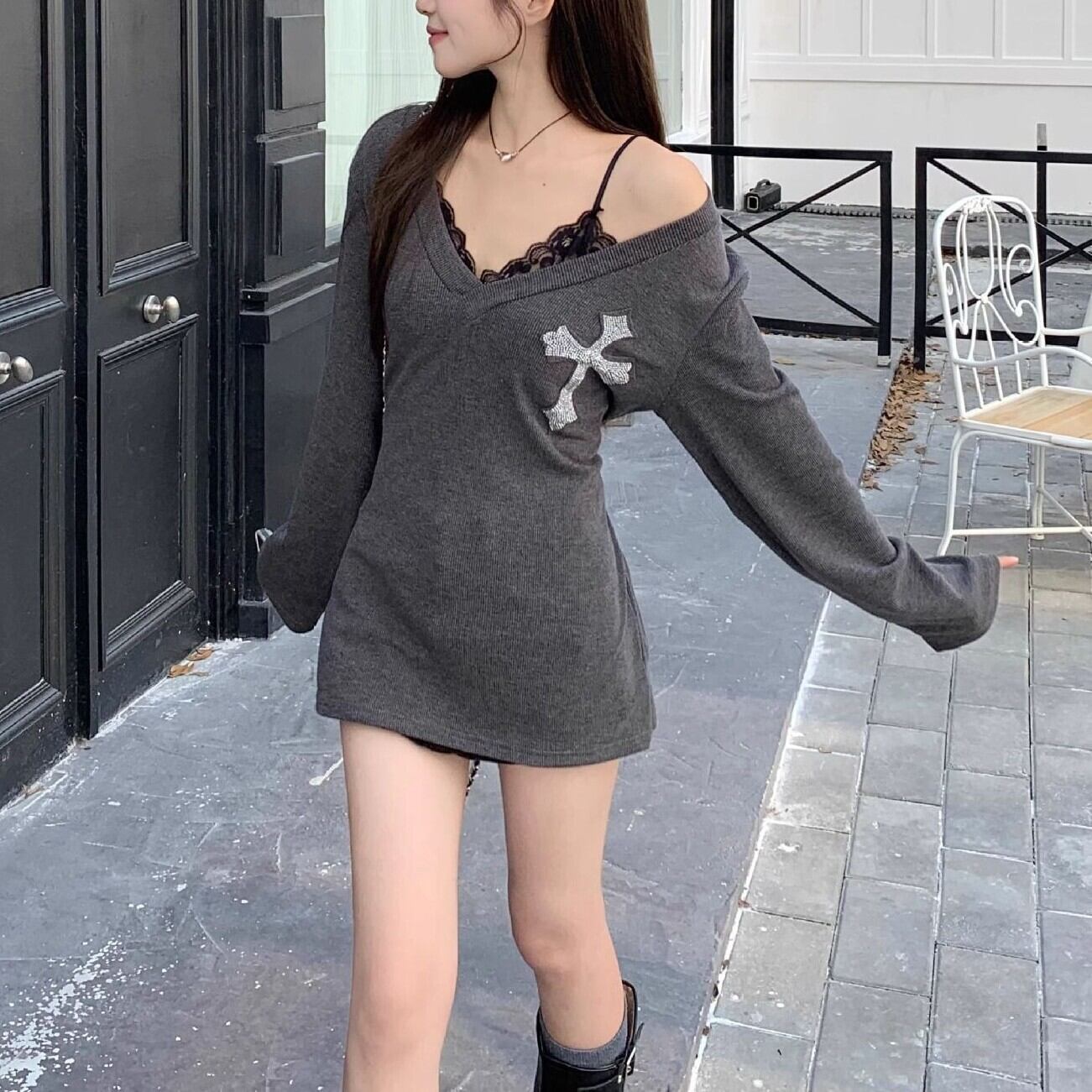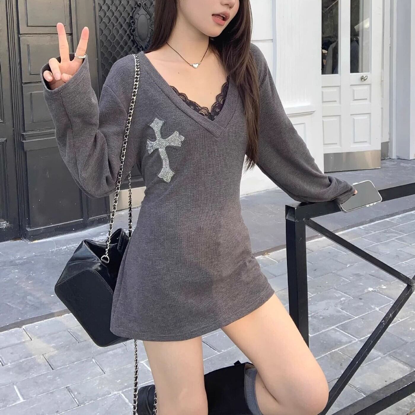 レディース ワンピース ショート 長袖 Vネック Aライン ハイウエスト 大人可愛い きれいめ おしゃれ かっこいい ガーリー クール 都会的 セクシー プリント 春 秋 通勤 デート お出かけ お泊まり イベント 旅行 レストラン 公園 女子会 休日 ホテル ショッピング コンサート ライブ カフェ 韓国 コーデ 楽ちん プレゼント 美脚 脚長 普段使い 着回し モテ インスタ映え S M L XL 大きいサイズ グレー