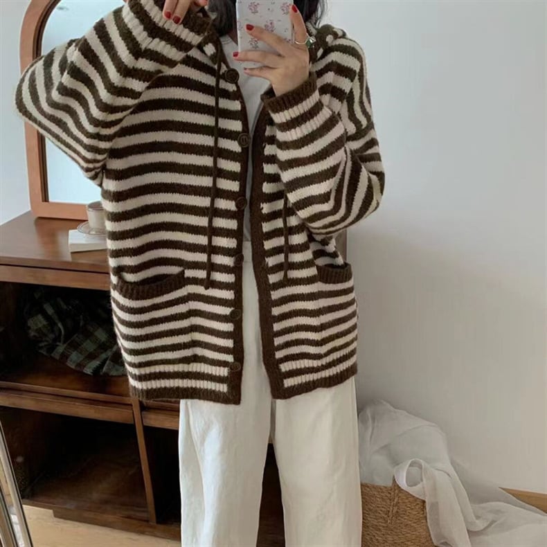 柔らかなボーダー柄がナチュラルな雰囲気を演出する、ゆったりシルエットのニットカーディガンです。ドロップショルダーと程よくルーズなサイズ感で、リラックスしながらこなれた着こなしが楽しめます。フロントボタン仕様でトップス感覚でも羽織としても活躍し、パンツにもスカートにも合わせやすく、デイリーコーデの幅を広げてくれます。