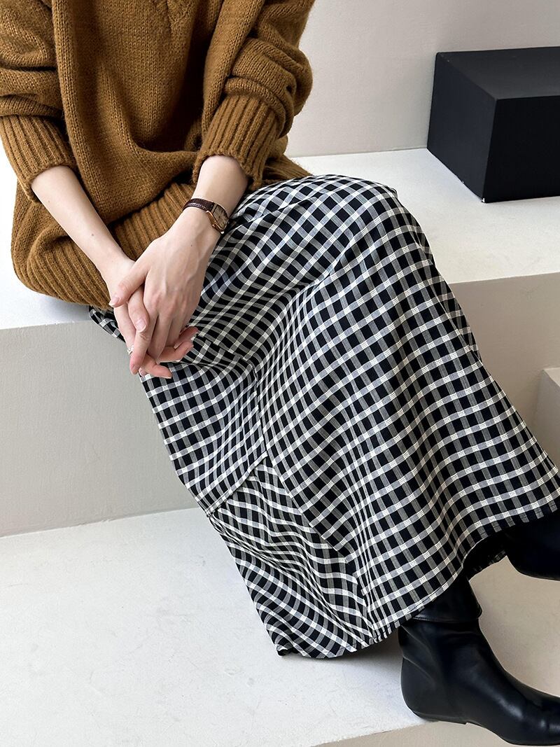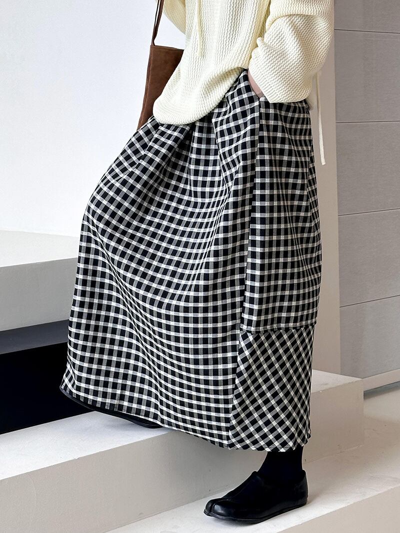 やさしいチェック柄が目を引く、レトロ感のあるロングギャザースカートです。たっぷり入ったギャザーとウエストゴム仕様で、楽ちんなはき心地と自然な広がりを楽しめます。