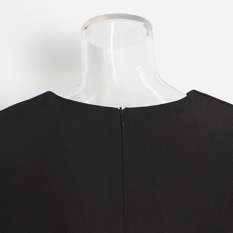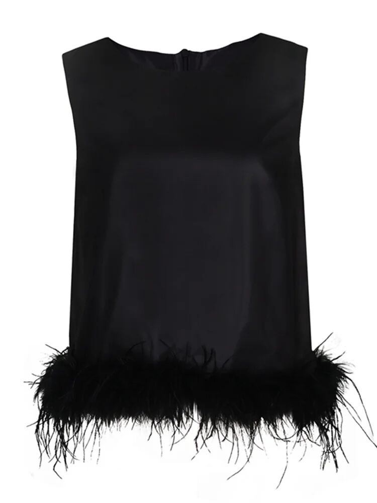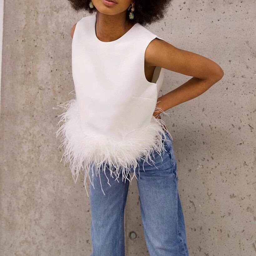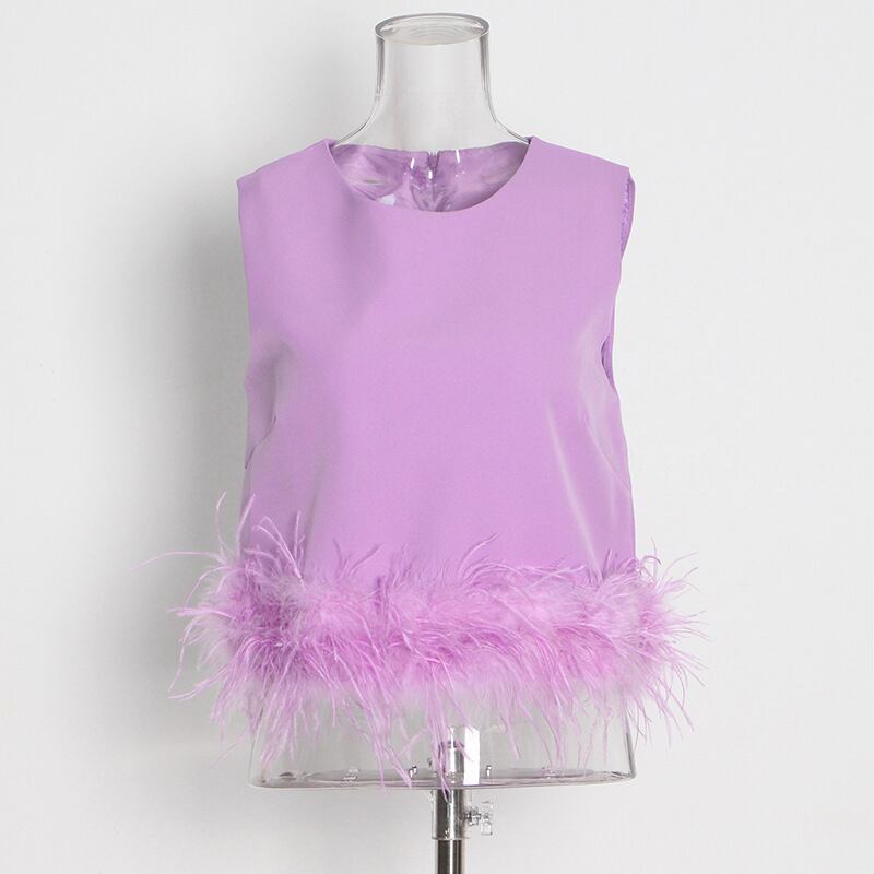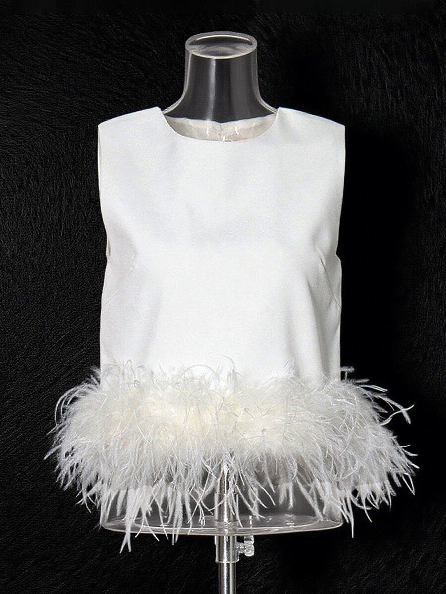 裾にあしらわれたフェザーデザインが目を引く、存在感のあるノースリーブトップスです。クルーネック×襟なしのすっきりしたデザインで、甘さの中に洗練された印象を演出します。