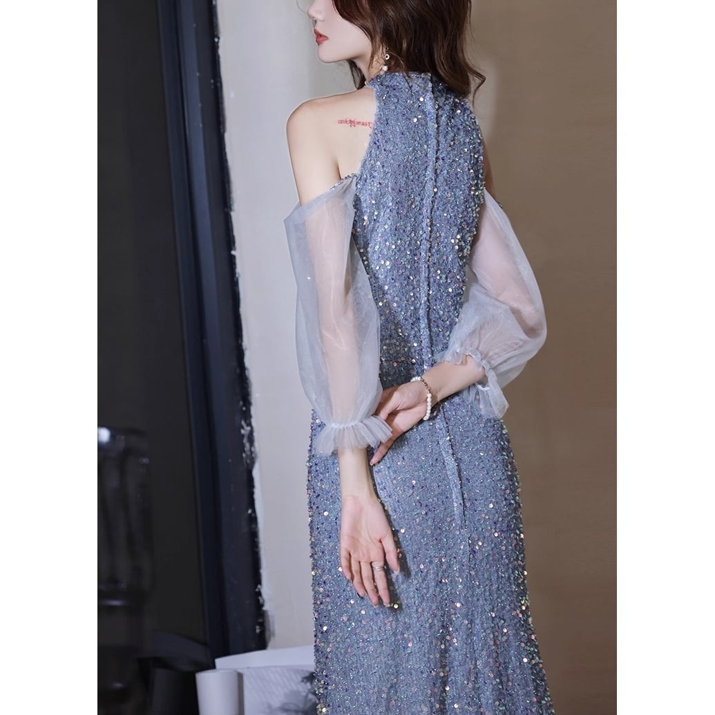 きらびやかな全身にオフショルダーのシアースリーブがポイントの1着。洗練されたスタイルを約束させる曲線美で特別な日のドレスアップにも対応。すそが美しくなびくコントラストによってシルエットに緩急が誕生。はっとするような女らしさが香る仕草まで優雅に見せる。