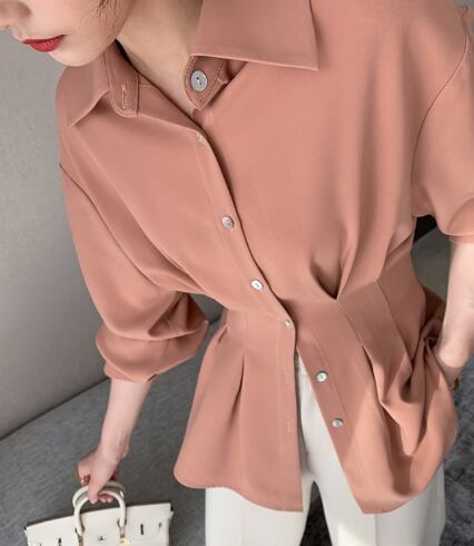 レディース トップス シャツ ブラウス 前開き ハーフ レギュラースリーブ 襟付き 角襟 ボタンダウン スリム タックプリーツ ハイウエスト 前開き ボタン 切り替えデザイン 薄手 ポリエステル カシミヤ かわいい 大人可愛い シンプル おしゃれ 無地 秋 授業参観 10代 20代 30代 40代 通勤 デート お出かけ イベント レストラン ショッピング 合コン コンパ カフェ 婚活 重ね着 お揃い 脚長 S M L XL 2XL 黒 アイボリーホワイト 小麦グレー ピーチピンク