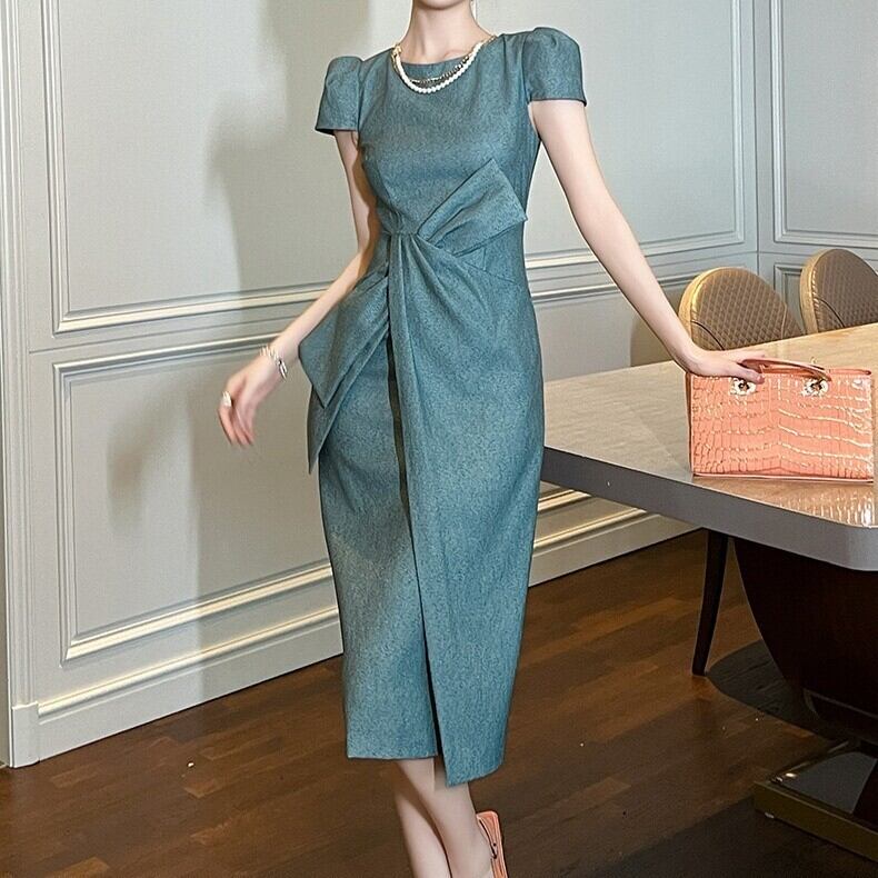 ドレス ワンピース ウェディング パーティー 結婚式 二次会 披露宴 演奏会 発表会 ステージ 舞台 フォーマル 謝恩会 ミディアム丈 半袖 ラウンドネック ファスナー ハイウエスト きれいめ 大人可愛い 上品 おしゃれ かっこいい ガーリー クール エレガント 主役級 存在感 ゴージャス 華やか 無地 イベント 旅行 レストラン 韓国 脚長 高見え 格上げ 女子会 春 夏 秋 冬 シーズンレス S M ライトブルー