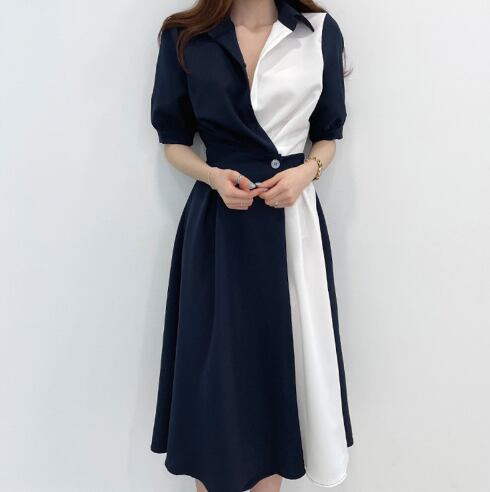 レディース ワンピース 膝下 5分袖 レギュラースリーブ 襟付き 角襟 Aライン ウエストマーク ボタン パッチワーク 綿 麻 大人可愛い シンプル おしゃれ アジアン エレガント リラックス 無地 夏 母の日 授業参観 20代 30代 40代 デート お出かけ イベント リゾート 海 女子会 ガーデン ショッピング コンサート 合コン コンパ 婚活 お揃い 楽ちん プレゼント 脚長 清楚 S M L XL 青と白 カードホワイト