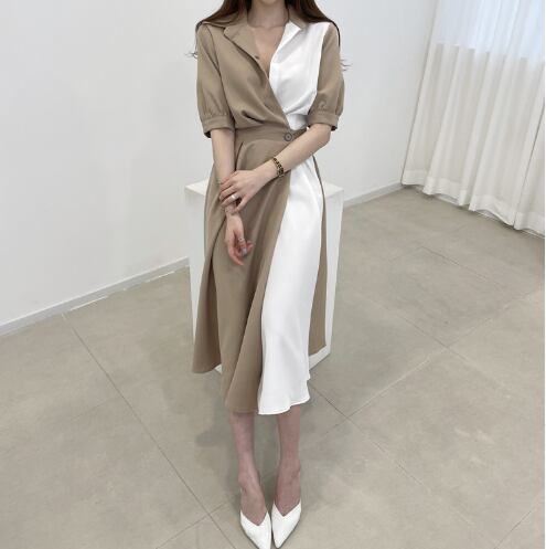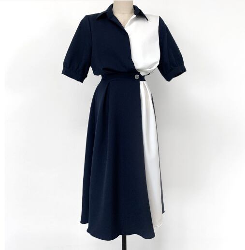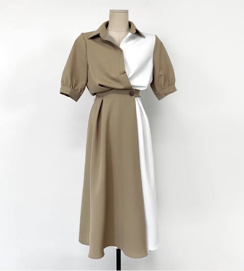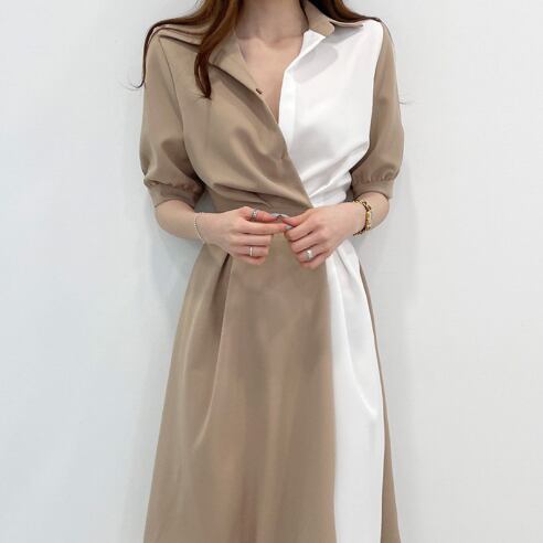 魅力的なレディースワンピースのご紹介です!こちらの膝下5分袖スタイルは、上品な襟付きデザインとウエストマークが特長で、エレガントさとリラックス感を兼ね備えています。Aラインのシルエットが体型を美しく見せ、日常使いやデート、お出かけに最適!シンプルながらも大人可愛い印象を与えます。