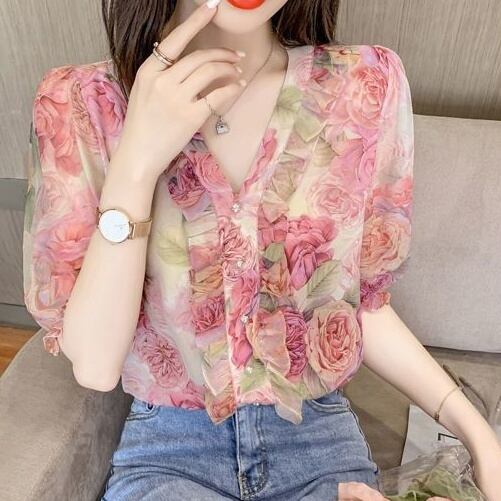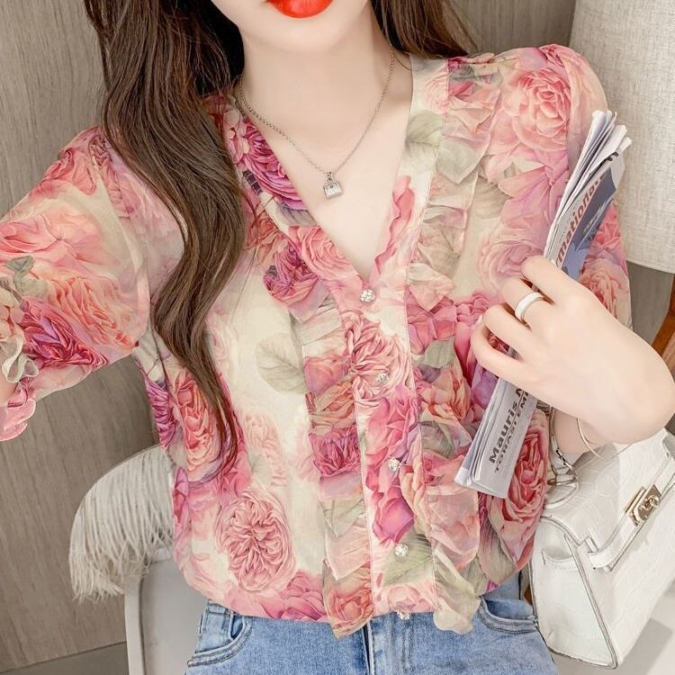 トップス シャツ シフォンシャツ 5分袖 Ⅴネック フリル 前開き ボタン シースルーミディアム丈 透け感 可愛い かわいい 大人可愛い きれいめ シンプル 上品 おしゃれ レトロ かっこいい カジュアル こなれ感 個性的 主役級 存在感 抜け感 春 夏 ナチュラル ベーシック エレガント 花柄 女性用 レディース ママ OL 通勤 オフィス 学生 通学 デート お出かけ お泊まり 女子会 旅行 カフェ ショッピング コンパ 普段使い デイリー イベント 着回し 重ね着 S M L XL 2XL トレンド