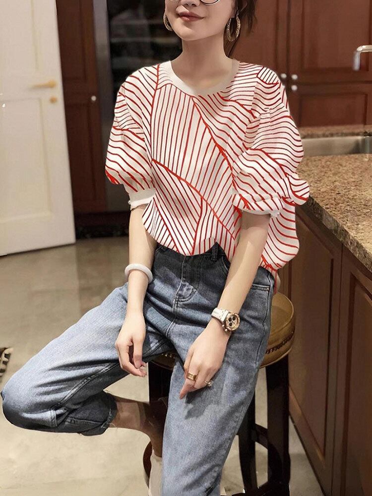 トップス カットソー 5分袖 ボリューム袖 ラウンドネック プルオーバー ミディアム丈 可愛い かわいい 大人可愛い きれいめ シンプル 上品 おしゃれ レトロ かっこいい カジュアル こなれ感 個性的 ラフ ルーズ 主役級 存在感 抜け感 春 夏 ナチュラル ベーシック クール 女性用 レディース ママ OL 通勤 オフィス 学生 通学 デート お出かけ お泊まり 女子会 会議 旅行 カフェ ショッピング コンパ 普段使い デイリー イベント 着回し 重ね着 S M L XL トレンド モテ ゆったり
