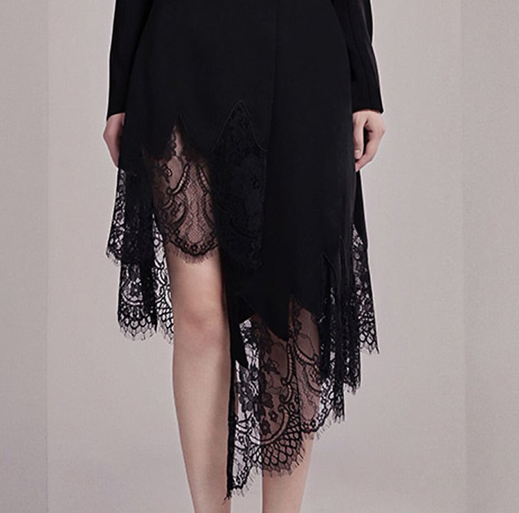 繊細な刺繡とエレガントなレースが印象的で、シースルーのアシンメトリーデザインが個性的な魅力を演出します。