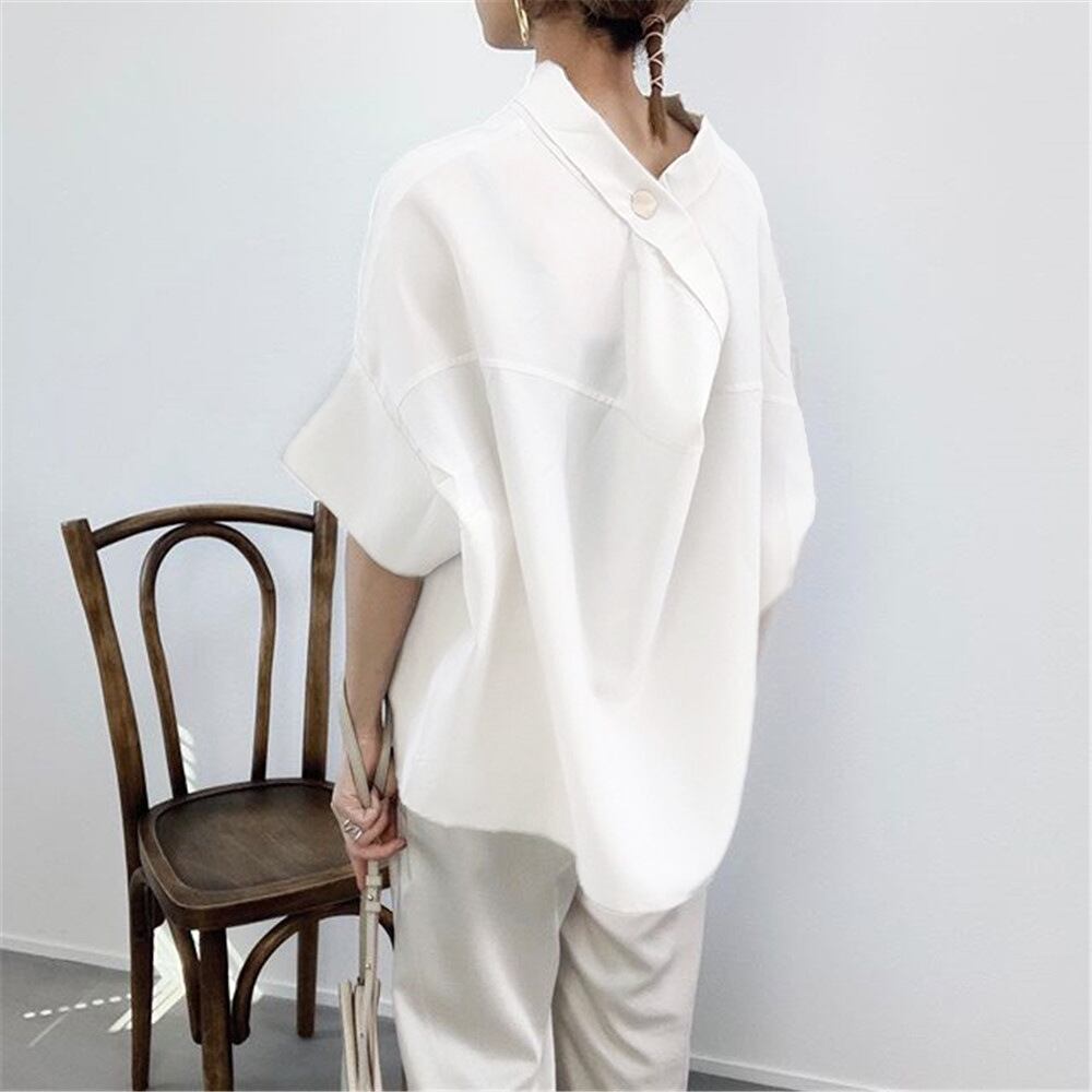 レディース トップス シャツ チュニック ミディアム ミドル丈 5分袖 ドルマンスリーブ 襟付き スタンドカラー ワイド ドレープ オーバーサイズ バックコンシャス ボタン きれいめ シンプル カジュアル 上品 おしゃれ かっこいい こなれ感 ラフ ルーズ 個性的 クール 存在感 抜け感 リラックス 無地 春 夏 ママ 学生 学校 通学 デート お出かけ 旅行 女子会 休日 ホテル ショッピング カフェ 体型カバー 普段使い 着回し ゆったり ゆる フリーサイズ ホワイト カーキ ベーシックカラー