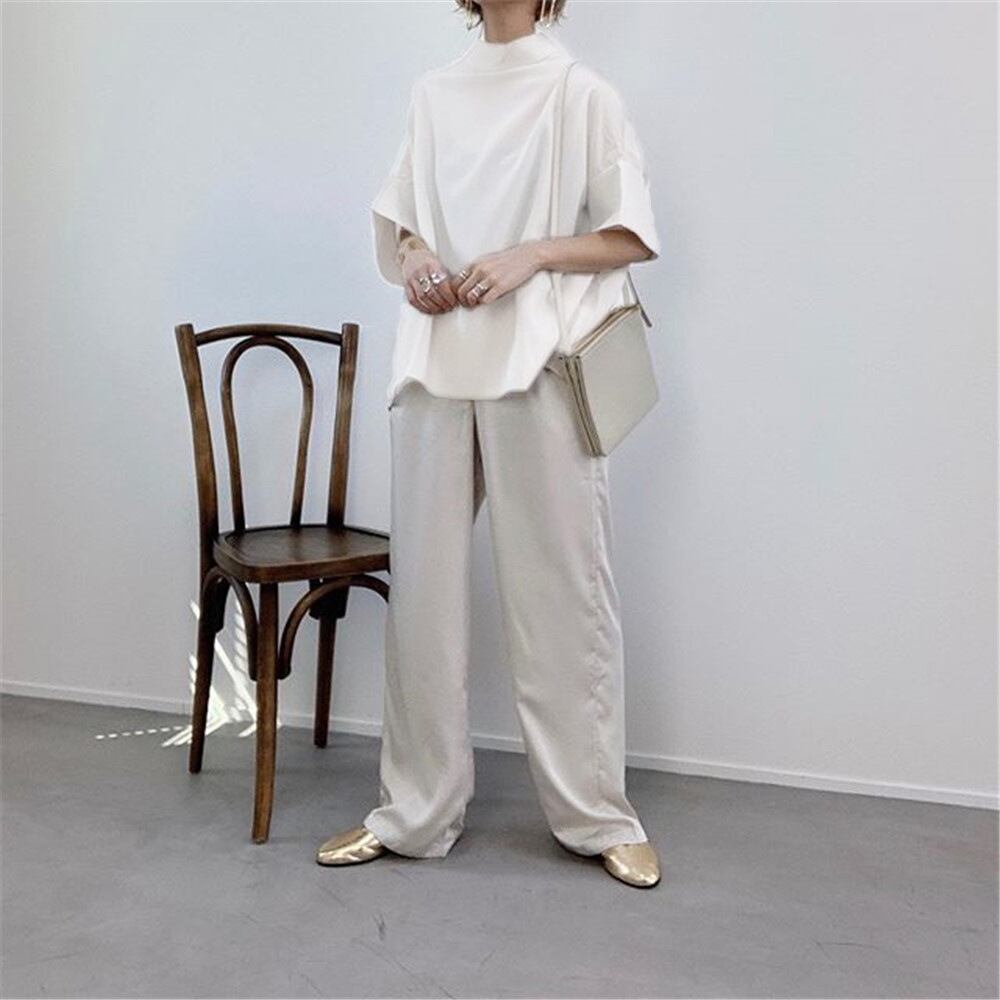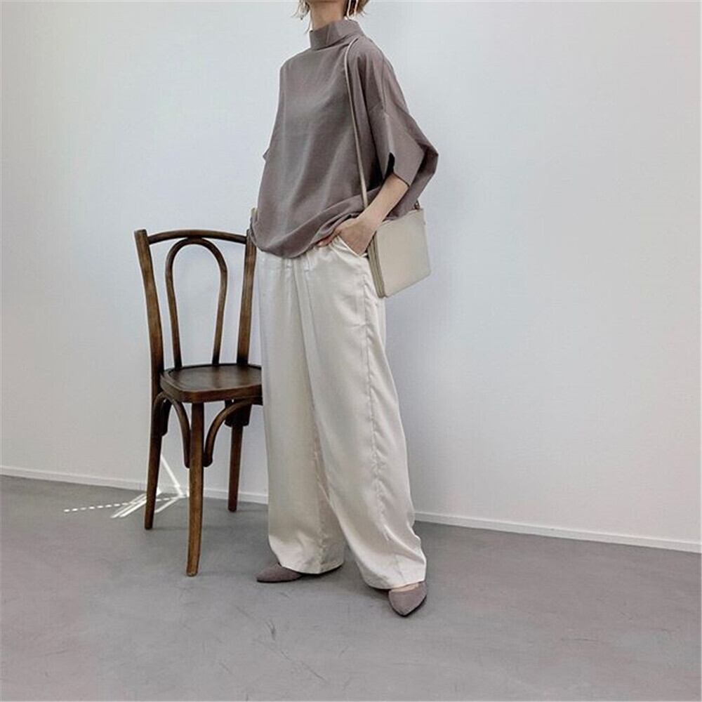 立体的なドレープが美しい表情を生む、スタンドデザインの5分袖バックコンシャスシャツ。ワイドでオーバーサイズなシルエットが、体型を自然にカバーしながら都会的で洗練された印象を与えます。バックネックのボタン仕様がさりげない存在感を演出し、きれいめにもクールにも着こなせる一枚です。