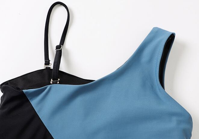 水着 ビキニ ワンピース ワンショル パッド付き 伸縮性 安定感 アシンメトリー シンプル 大人っぽい 存在感 個性的 セクシー カラーブロッキング 無地 リゾート 旅行 温泉 プール 夏 海 ビーチ 美脚 スタイルアップ 背中見せ M L XL ブルー&ブラック
