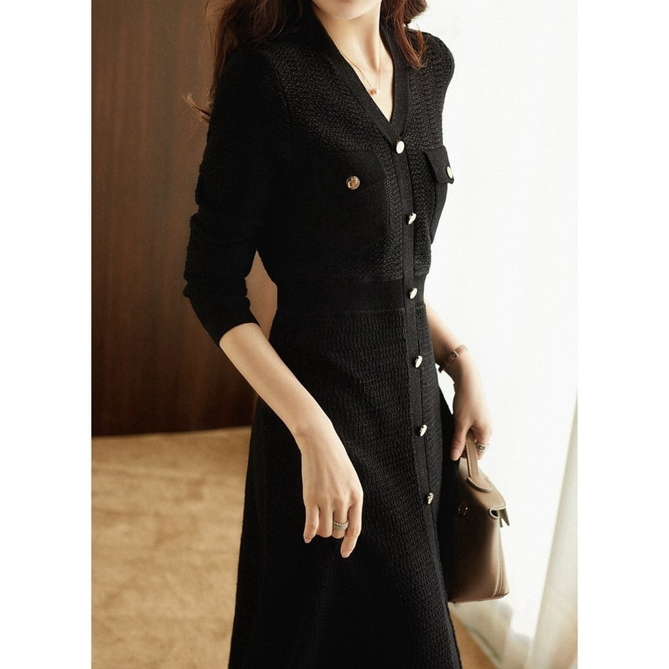 ワンピース ロングワンピース ツイード調ワンピース Aラインワンピース レトロワンピース ツイード風ロングワンピース Vネック 7分袖 ロング丈 ひざ下丈 無地 金ボタン ニットワンピース Aライン フレア レディース かわいい 大人可愛い おしゃれ ガーリー エレガント キュート きれいめ 上品 お出かけ ショッピング 休日 通勤 通学 デート 女子会 イベント 旅行 体型カバー ゆったり スタイルUP デイリー 普段使い フェミニン 脚長 美脚 シンプル クラシカル カジュアル レトロ 鮮度アップ