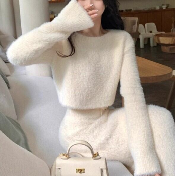 ふわふわとした質感が心地よい、クロップド丈のオーバーサイズニットトップスとロング丈のタイトスカートのセットアップです。