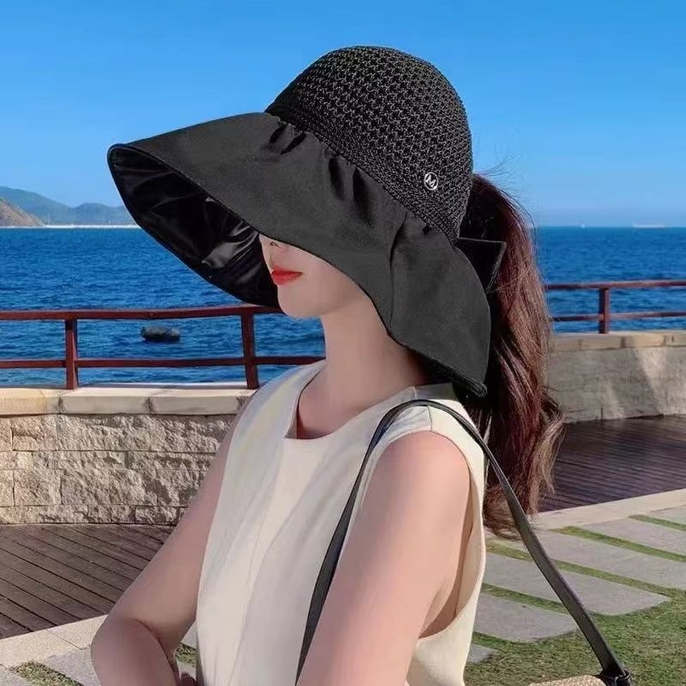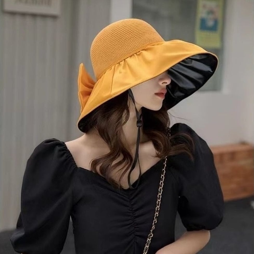 大きいリボンが女性らしい印象。帽子のクラウン部分はやわらかく丸みのあるフォルムで頭にやさしくフィット。異素材のつばが日差しをしっかりと遮りながら顔まわりに上品な影をつくりフェイスラインを美しく見せてくれます。
