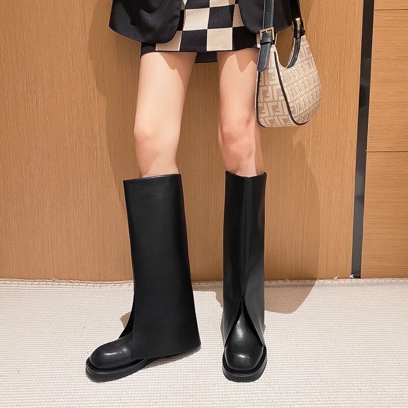 レディース ブーツ ロングブーツ 5cm 太ヒール ラウンドトゥ 美脚 脚長 シークレット 革 シンプル おしゃれ 存在感 無地 冬 OL 通勤 デート お出かけ イベント リゾート 旅行 ホテル レストラン 公園 休日 スタイル 22.5cm 23.0cm 23.5cm 24.0cm 24.5cm 25.0cm 黒