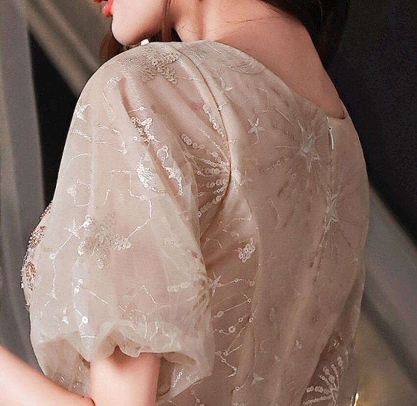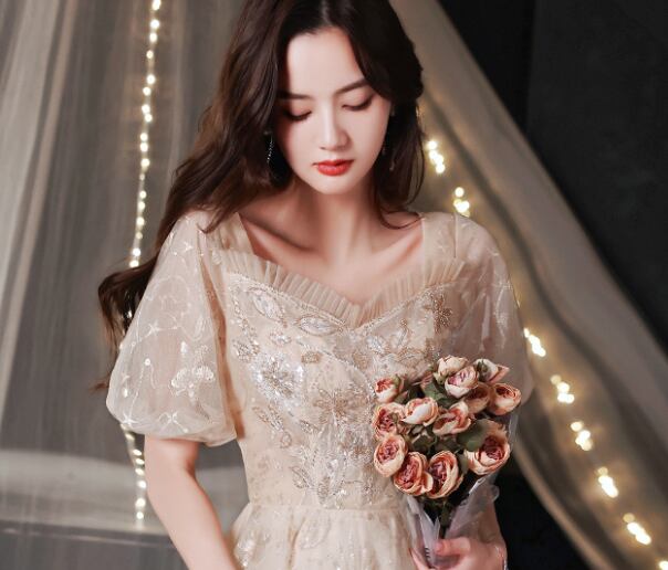 ドレス ウェディング パーティー 二次会 披露宴 演奏会 発表会 ステージ 舞台 ロング ミディアム丈 半袖 7分袖 Vネック プリンセスライン Aライン イブニング 刺繍 ファスナー ハイウエスト 薄手 ポリエステル繊維 シンプル 大人可愛い 上品 おしゃれ エレガント 存在感 花柄 パーティー イベント ホテル ガーデン レストラン 光沢感 シーズンレス S M L XL 2XL ベージュ