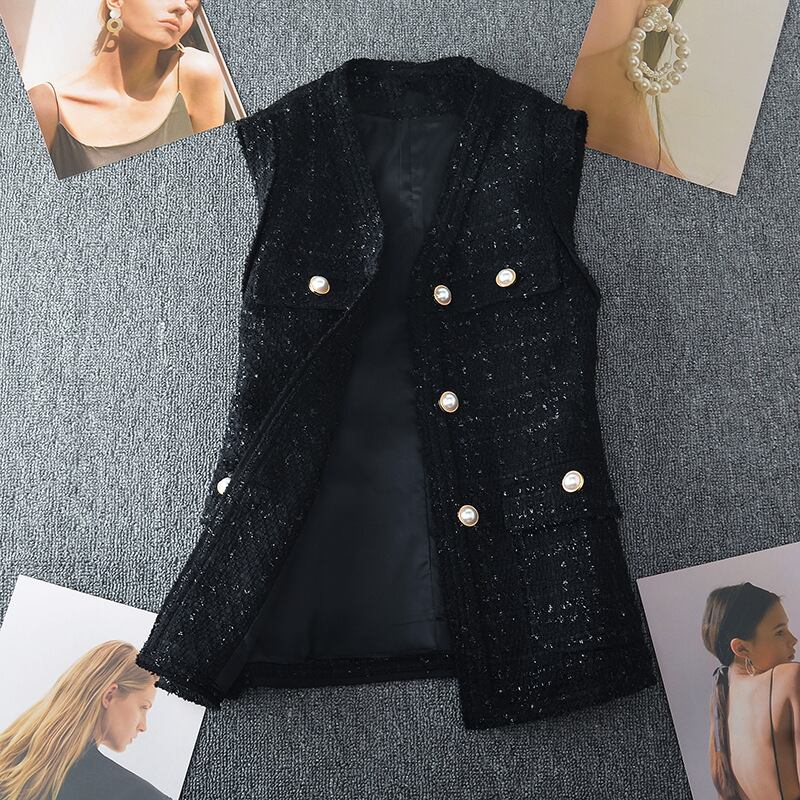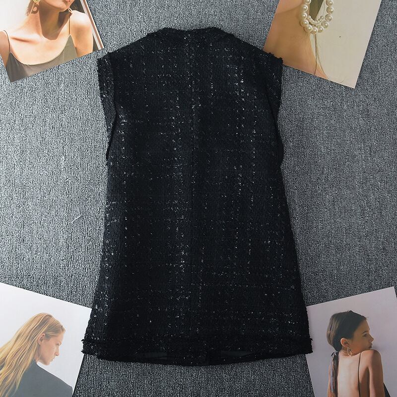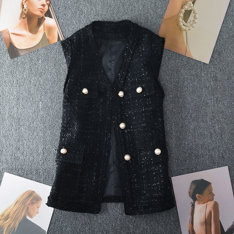 レディース ベスト ミドル丈 袖なし Vネック 襟なし Aラインプラスサイズ ダブルブレストのご紹介です!落ち着いた印象の無地デザインと、華麗な輝きを放つラメ素材が魅力の一着。シンプルながらも存在感抜群で、さまざまなシーンで活躍します。