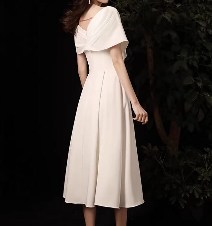 ドレス ウェディング パーティー 二次会 演奏会 発表会 ステージ 舞台 ミディアム丈 半袖 Vネック Aライン イブニング プリーツ ハイウエスト サテン シンプル 上品 おしゃれ エレガント 存在感 ナチュラル 無地 パーティー イベント リゾート シーズンレス S M L XL 2XL ホワイト ブラック グリーン