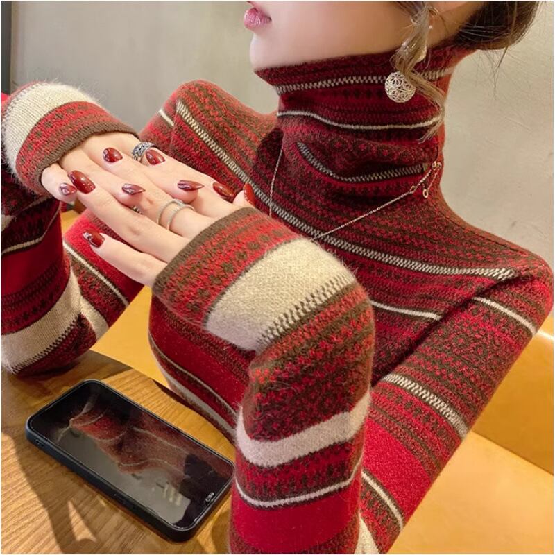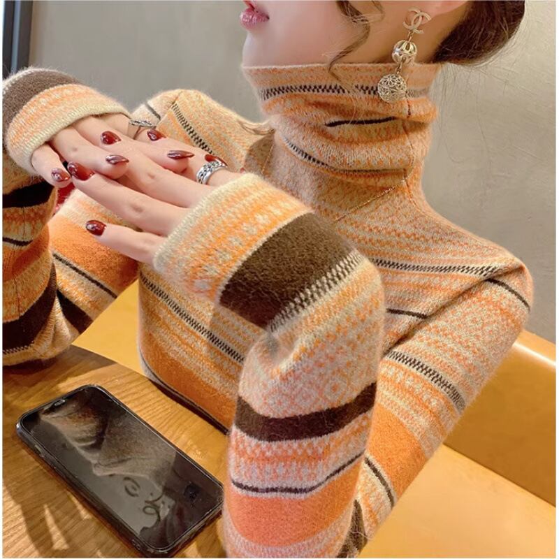 レディース ニット セーター レギュラー丈 長袖 レギュラースリーブ タートルネック スリム プルオーバー 中厚手 ニット シンプル カジュアル おしゃれ レトロ 存在感 ストライプ 秋 冬 OL 通勤 お出かけ アウトドア キャンプ イベント リゾート 旅行 公園 女子会 休日 ガーデン ショッピング コンサート ライブ カフェ 暖かい 普段使い 定番 S M L XL 2XL オレンジ レッド グリーン コーヒーブラウン