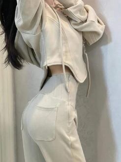 ウエストマークやサイドジップのポケットがポイントで、かわいさと実用性を兼ね備えています。コットンとスパンデックスの中厚手素材は肌触りが良く、春や秋の肌寒い日に最適です。色展開はシンプルな米杏色で、どんなスタイルにも合わせやすく、10代から30代の幅広い層におすすめです。
