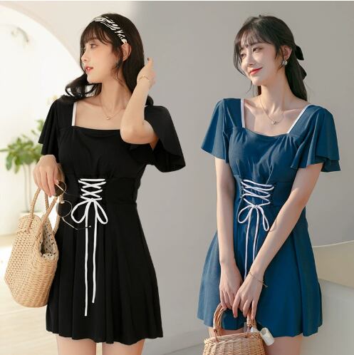 水着 スイムウェア 体型カバー 半袖 フリルショルダー リボン ウエストマーク ウエストリボン ハイウエスト かわいい シンプル ナチュラル おしゃれ アジアン 無地 リゾート プール 夏 海 10代 20代 30代 40代 韓国 体型カバー スタイルカバー ぽっちゃり M L XL ブルー 黒
