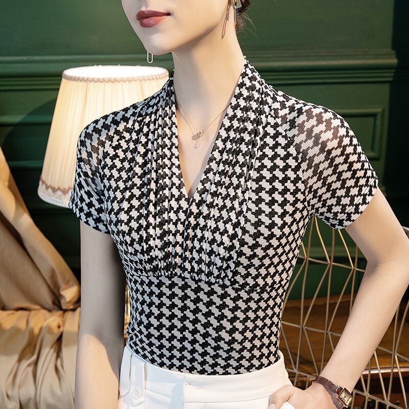 レディース トップス カットソー Tシャツ レギュラー丈 半袖 Vネック タイト スリム プルオーバー 薄手 メッシュ シンプル おしゃれ 存在感 シック スタイリッシュ チェック 千鳥格子 秋 冬 OL 通勤 お出かけ お泊まり アウトドア キャンプ イベント リゾート 旅行 海 プール ビーチ 公園 女子会 休日 バカンス 普段使い 着回し S M L XL 2XL 3XL 黒