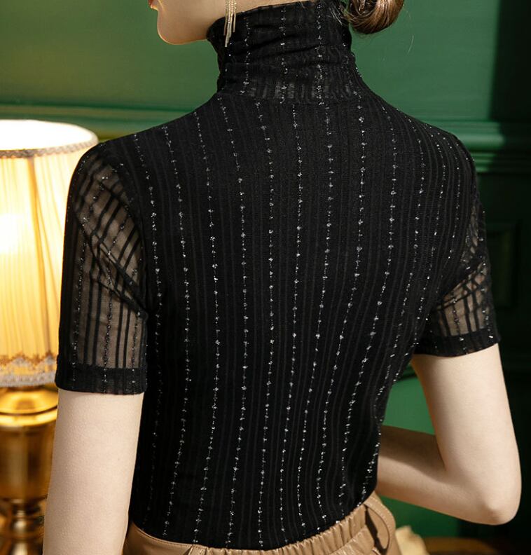 レディース トップス カットソー レギュラー丈 半袖 ハイネック タイト スリム プルオーバー 薄手 メッシュ 上品 おしゃれ 個性的 エレガント 存在感 ストライプ ラメ 秋 OL 通勤 デート お出かけ イベント リゾート 旅行 海 ビーチ 女子会 休日 バカンス ショッピング 発表会 コンサート カフェ 普段使い セクシー S M L XL 2XL 3XL 黒