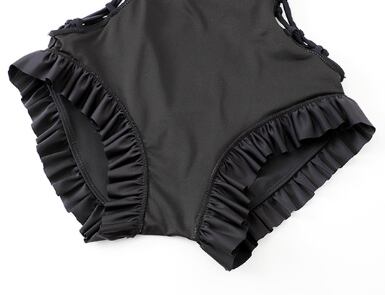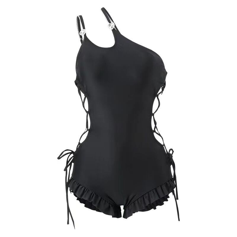 水着 レディース 紐 ワンショル パッド付き リボン フリル スリット 大人可愛い カジュアル おしゃれ 存在感 ラブリー セクシー 無地 リゾート 旅行 温泉 プール 夏 海 ビーチ 美脚 スタイルアップ インスタ映え S M L XL ブラック