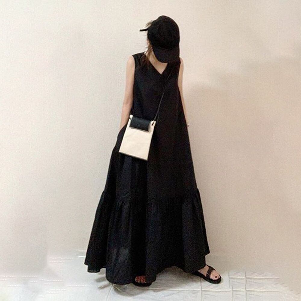 レディース スカート ワンピース ロングスカート ロング ノースリーブ Vネック ワイド Aライン ティアード タック ふわふわ 透け感 ルーズタイプ 薄手 綿 ポリエステル スプライシング シンプル カジュアル ナチュラル 無地 夏 お出かけ イベント リゾート 旅行 海 プール ビーチ 公園 女子会 休日 バカンス ショッピング カフェ 体型カバー ゆったり フリーサイズ 黒
