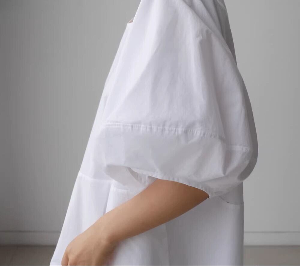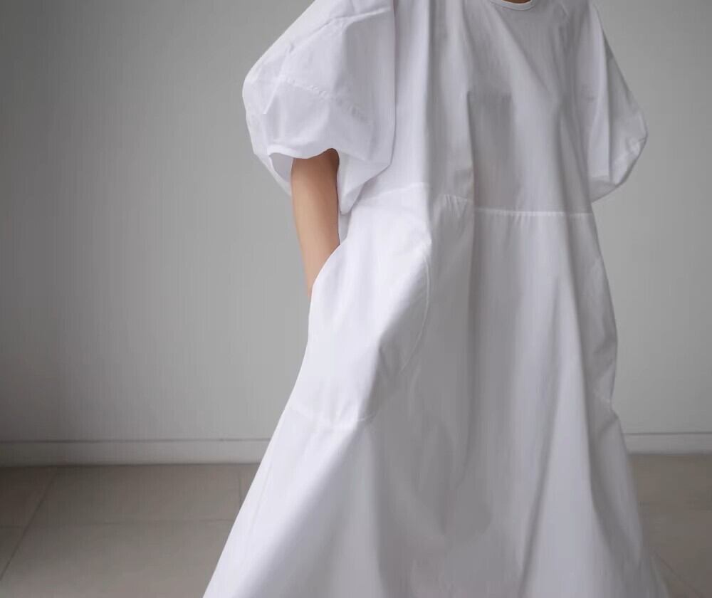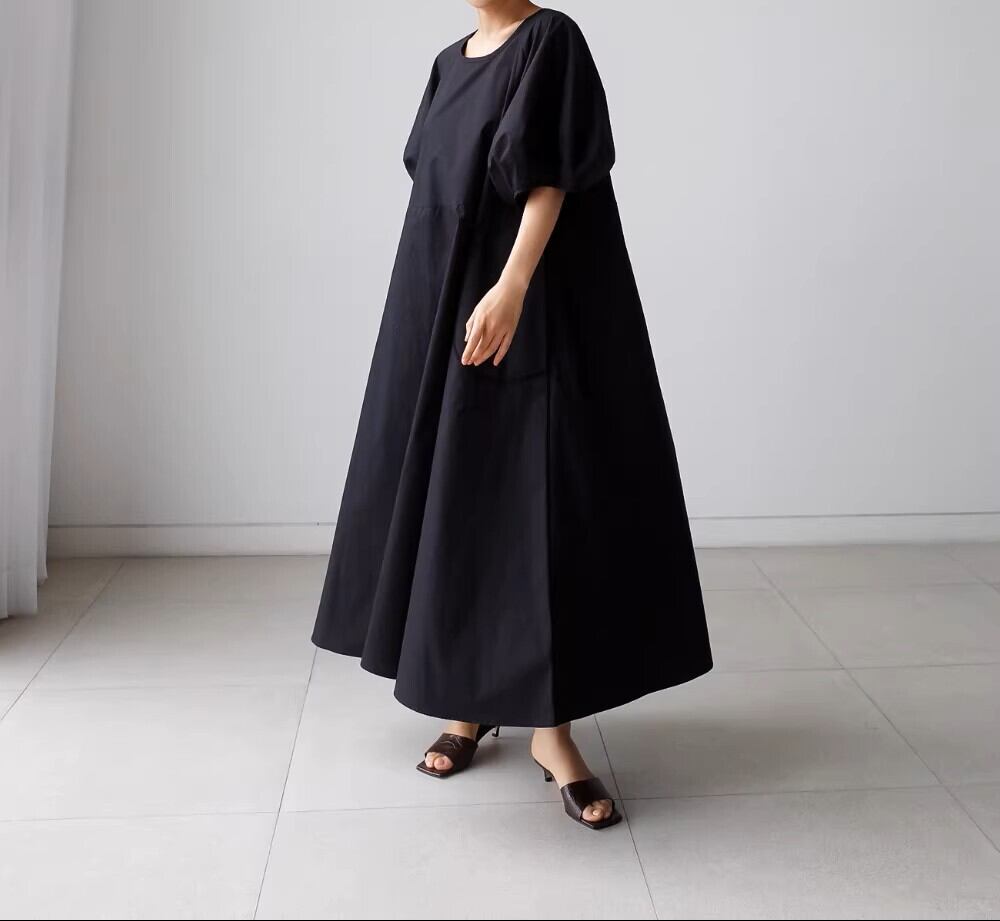 夏のファッションにぴったりな、可愛らしい印象のロングワンピースが登場しました!半袖のランタンスリーブとクルーネックデザインが、清楚でおしゃれな雰囲気を醸し出します。ワイドでAラインのシルエットが、体型を気にせずに優雅に着こなせるポイントです。