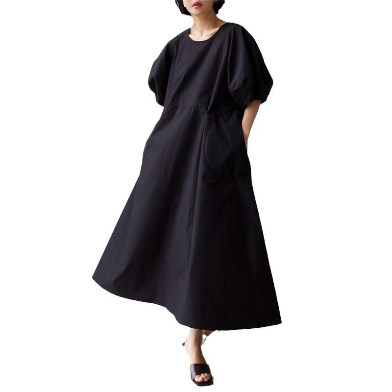 レディース ワンピース ロングスカート ロング 半袖 ランタンスリーブ クルーネック ワイド Aライン オーバーサイズ プルオーバー ポケット 薄手 コットン 麻 シンプル カジュアル おしゃれ 個性的 存在感 ベビードールドレス風 無地 夏 お出かけ アウトドア キャンプ リゾート 旅行 海 プール ビーチ 公園 女子会 休日 バカンス ショッピング カフェ 体型カバー 普段使い S M L XL 白 黒 緑